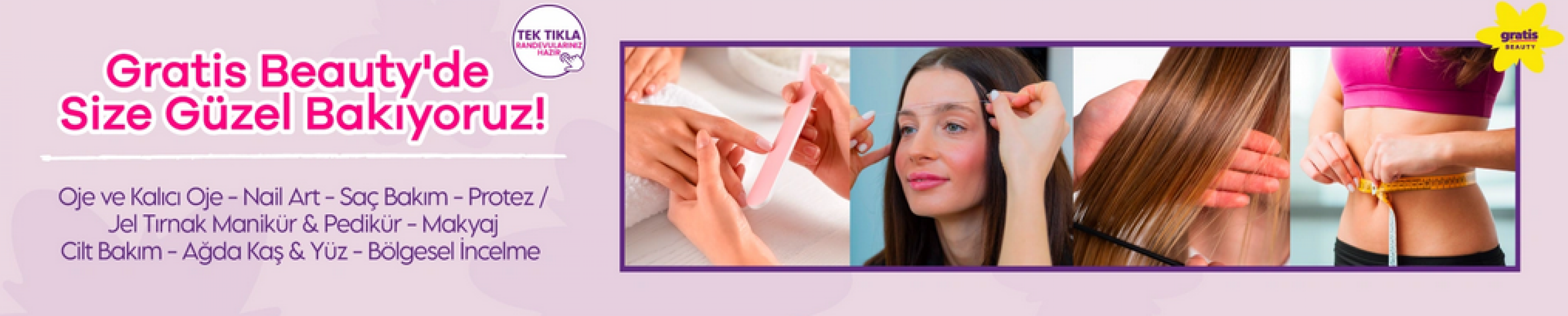 Gratis mağazalarında Beauty bölümü, profesyonel hizmetleriyle dikkat çekiyor. Manikür-pedikür, jel tırnak, kalıcı oje, nail art, saç bakım ve makyaj hizmetlerinin yanı sıra, bölgesel incelme ve ağda-kaş gibi hizmetler de mağazalarda yer almakta. Tüm bu güzellik hizmetlerinden faydalanarak, kendinizi şımartabilirsiniz.