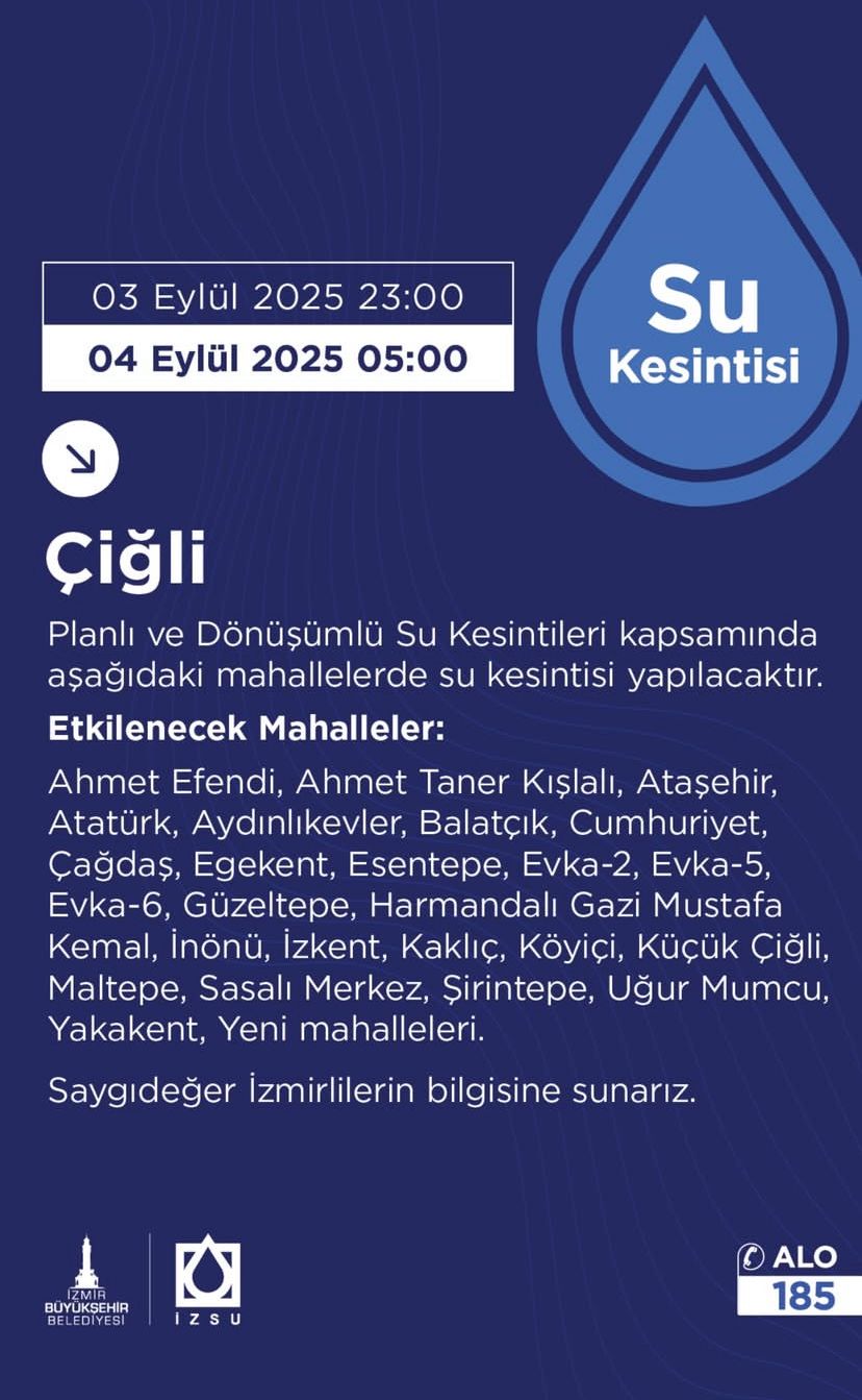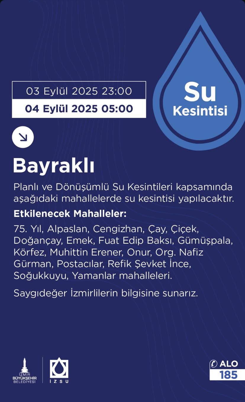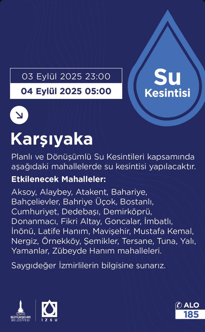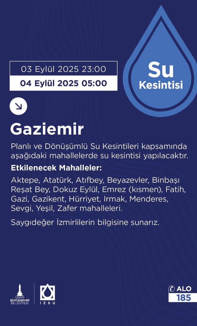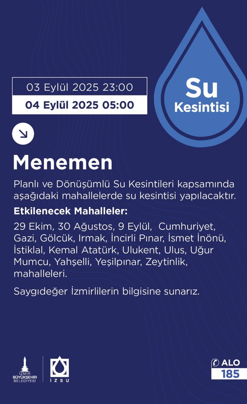 İzmirliler dikkat! 3 Eylül 2025 akşam saat 23:00’ten 4 Eylül sabah 05:00’e kadar Menemen, Karşıyaka, Gaziemir, Çiğli ve Bayraklı’da su kesintisi uygulanacak. Hangi mahallelerin etkileneceği ve suya erişim planı haberimizde.