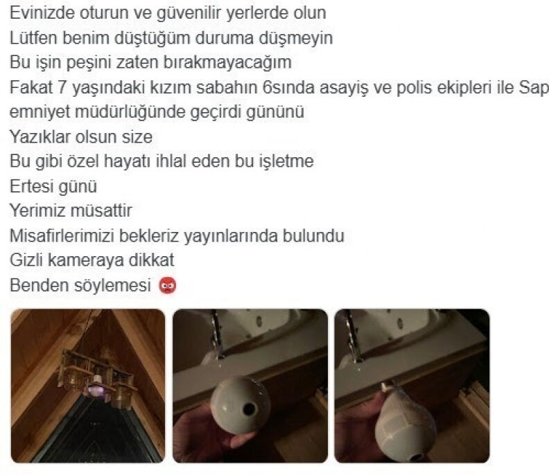 “Evinizde oturun ve güvenilir yerlerde olun. Lütfen benim düştüğüm duruma düşmeyin. Bu işin peşini zaten bırakmayacağım fakat 7 yaşındaki kızım sabahın 6'sında asayiş ekipleri ile Sapanca İlçe Emniyet Müdürlüğü'nde geçirdi. Yazıklar olsun size, bu gibi özel hayatı ihlal eden bu işletme ertesi gün, 'Yerimiz müsaittir misafirlerimizi bekleriz' yayınlarında bulundu. Gizli kameraya dikkat benden söylemesi.”