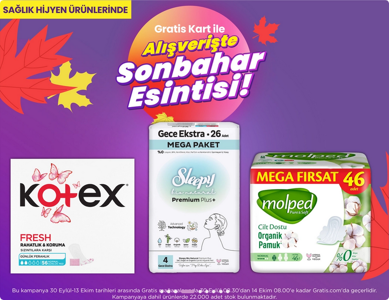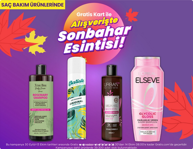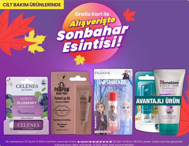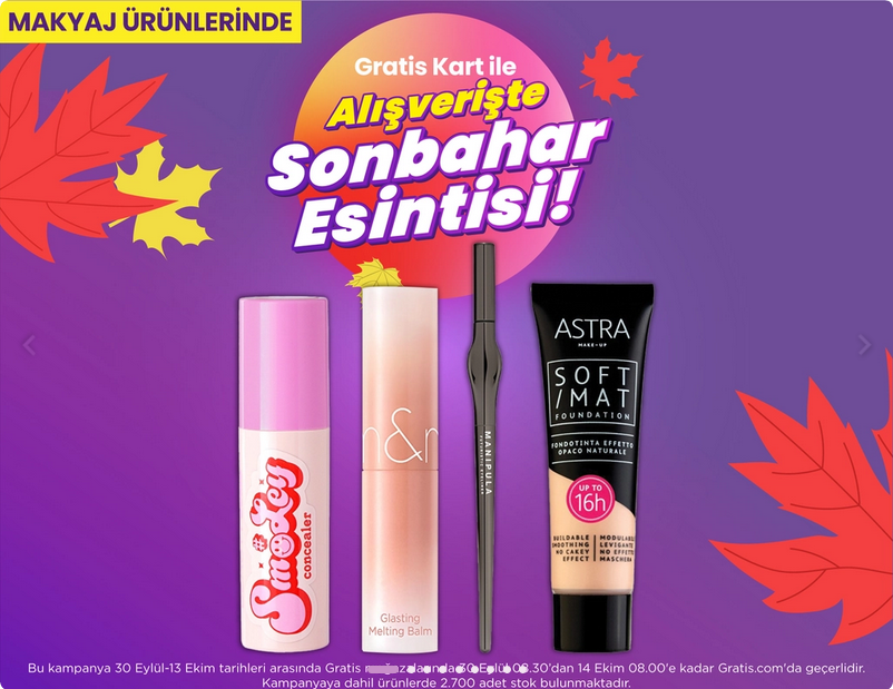 Türkiye'nin önde gelen kişisel bakım zincirlerinden Gratis, sonbahar mevsimine özel olarak hazırladığı "Gratis Kart ile Alışverişte Sonbahar Esintisi" kampanyasıyla raflarını fırsatlarla doldurdu. 30 Eylül 2025 tarihinde başlayan ve büyük bir kısmı 13 Ekim 2025'e kadar devam edecek olan bu kampanya, makyajdan cilt bakımına, saç ürünlerinden hijyen malzemelerine kadar geniş bir yelpazeyi kapsıyor.
