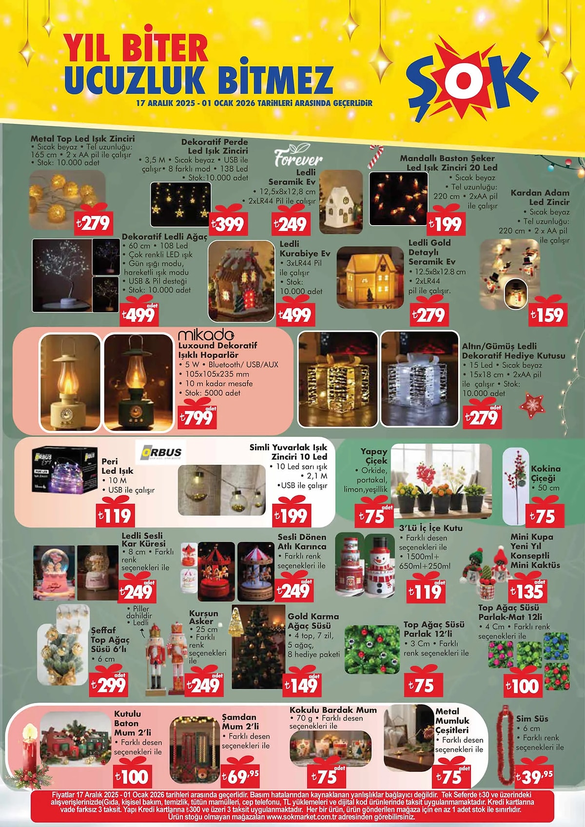 Evinize sıcak ve yılbaşı havasında dokunuşlar katmak isteyenler için bu hafta dekoratif ürünler de dikkat çekiyor. Dekoratif led ışık zincirleri, ledli seramik evler, kurabiye evleri ve kokina çiçeği, yılbaşı atmosferi oluşturmak isteyenlerin ilgisini çeken ürünler arasında yer alıyor.
