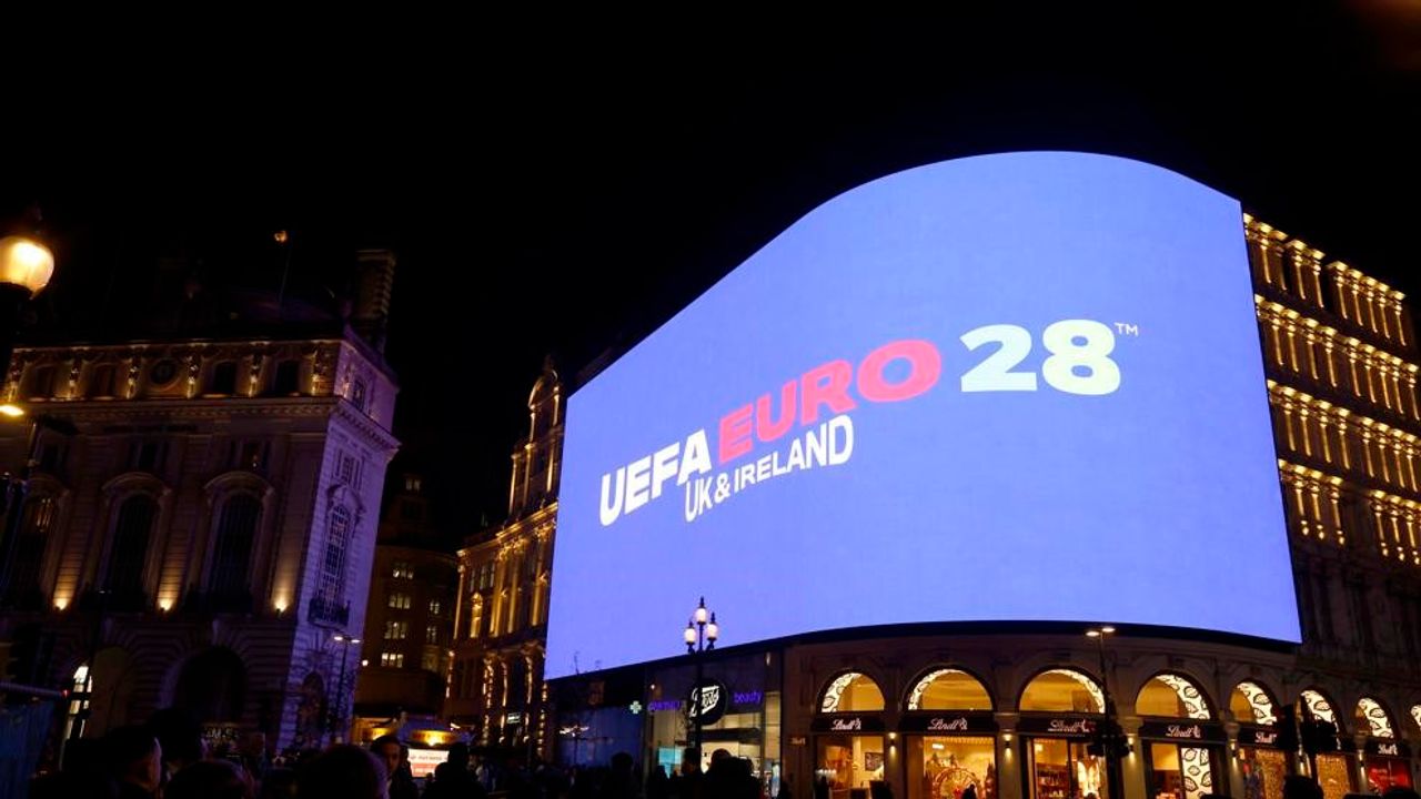 UEFA, turnuva markasının lansmanını Londra’da gerçekleştirirken, ev sahibi şehir logoları ve yeni turnuva logosu İngiltere ve İrlanda’nın pek çok noktasında ışık gösterileri ve dijital ekranlarla tanıtıldı.