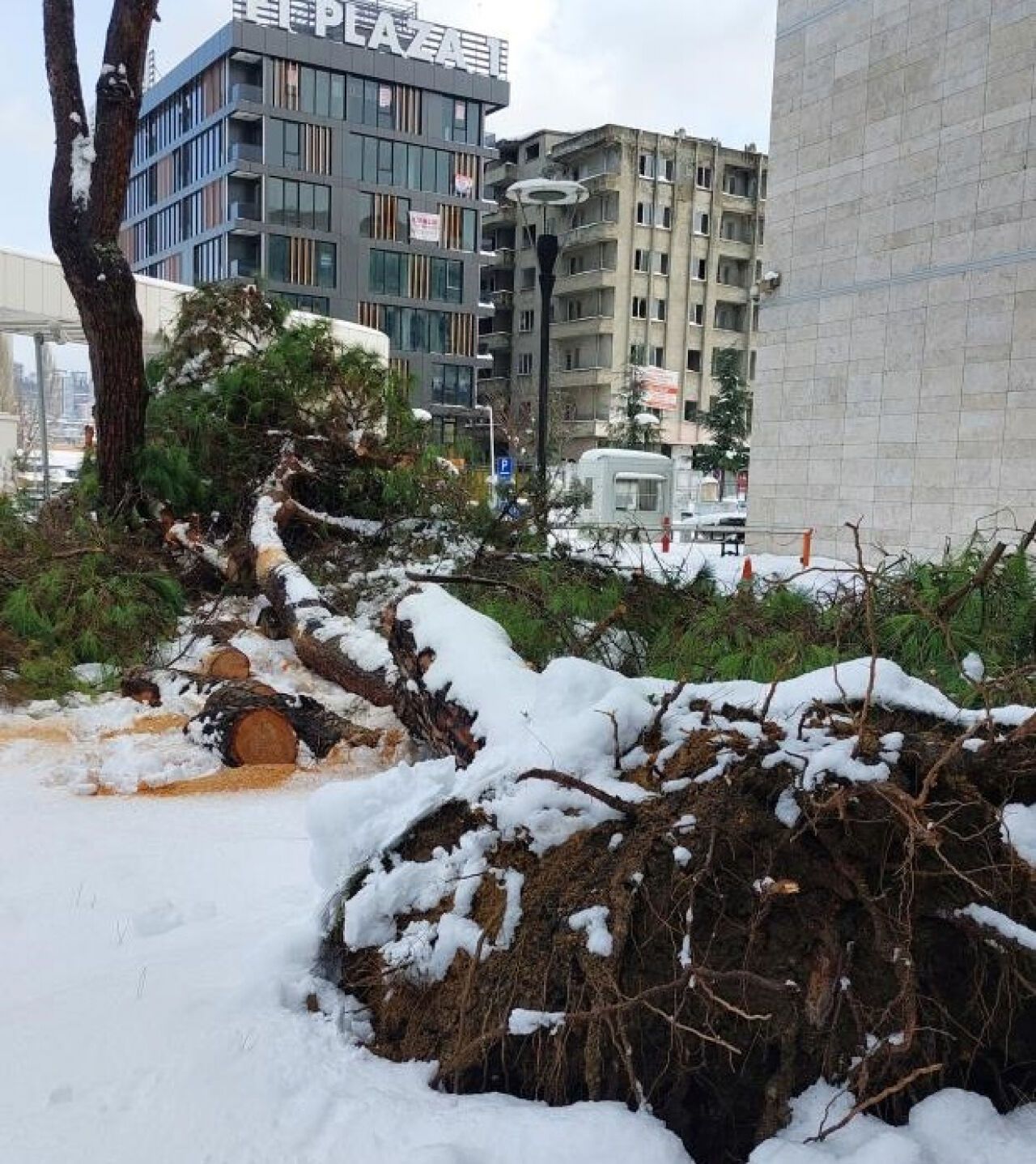 Adliye Sarayı bahçesinde bulunan çam ağacı, üzerindeki karın ağırlığını taşıyamayarak kökünden sökülüp devrildi. Olayda herhangi bir yaralanma yaşanmazken, çevredeki iş yerlerinin tente ve çatılarında da çökmeler meydana geldi. Yoğun kar yağışının etkisiyle, şehirdeki bazı ağaçlar ve yapılar da tehlike oluşturdu.