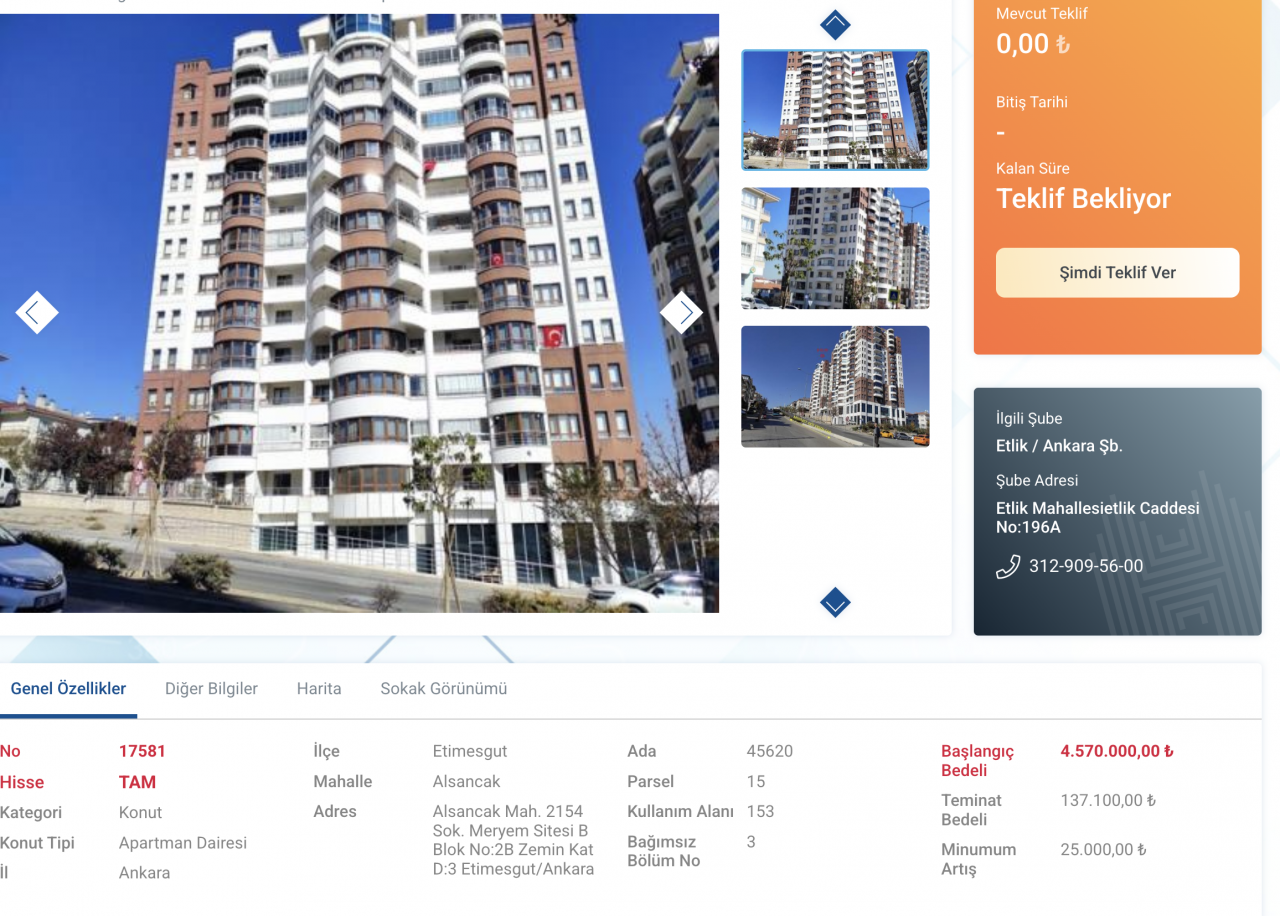 Halkbank gayrimenkul satış listesini yayınladı. Listede Etimesgut'ta bir apartman dairesinin de bulunduğu görüldü. Daire için başlangıç bedeli 4.570.000,00 TL olarak açıklandı. Teminat miktarı ise banka tarafından 137 Bin 100,00 TL olarak bildirildi.