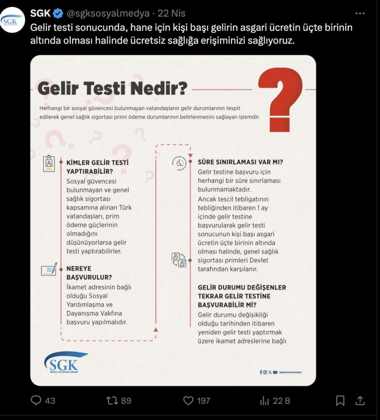 SGK sosyal medya hesabı üzerinden zaman zaman vatandaşlara bilgilendirmelerde bulunuyor. Bu kapsamda sosyal güvencesi olmayanları ilgilendiren yeni bir paylaşım da yapıldı. Buna göre, hane için kişi başı gelirin asgari ücretin üçte birinin altında olanlar ücretsiz sağlık hizmetinden faydalanabiliyor.