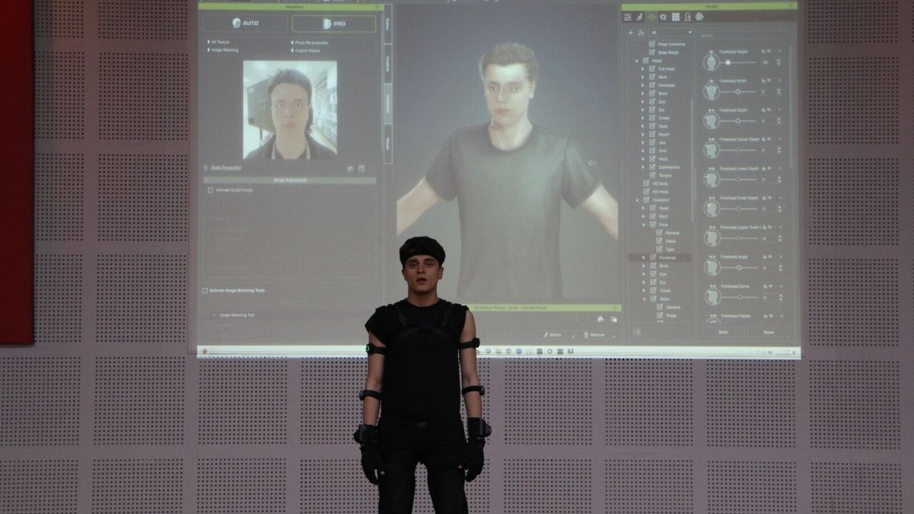 Motion capture teknolojisiyle hareketlerin gerçek zamanlı olarak dijital karaktere aktarıldığı uygulamada, model olan öğrencinin fotoğrafından dijital yüz modeli oluşturularak karakter tasarım yazılımlarıyla görsel düzenlemeler yapıldı ve ardından bu karakter Unreal Engine ortamına taşınarak eş zamanlı animasyon gösterimi gerçekleştirildi.