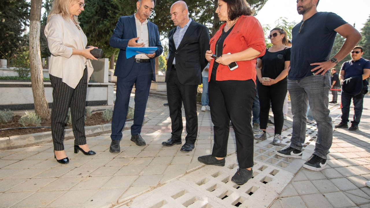İzmir Büyükşehir Belediye Başkanı Tunç Soyer, Bornova Işıkkent Mezarlığı ile yine mezarlık içerisinde bulunan Niyazi Zarife Ersoy Camii’ne konulan biri 3 diğeri ise 10 tonluk iki yağmur suyu hasadı deposunu inceledi.