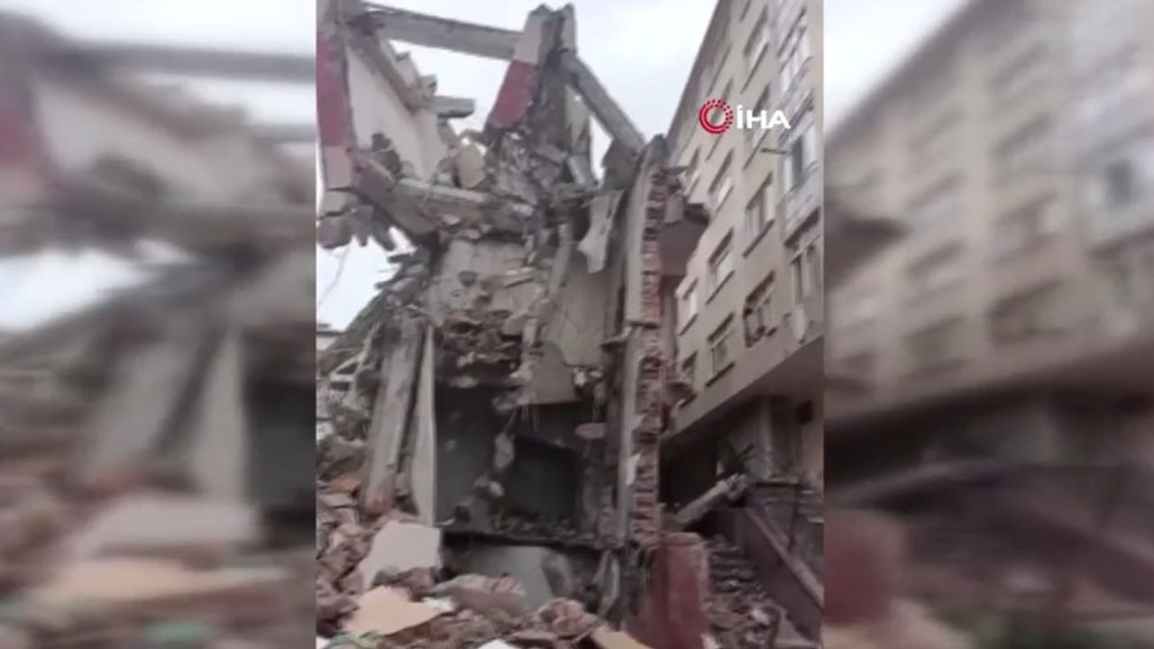 İstanbul Küçükçekmece'de kentsel dönüşüm kapsamında yıkımı yapılan bina yan taraftaki binanın üzerine devrildi.