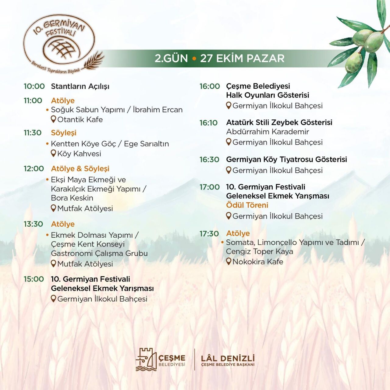Festivalin ilk günü, yöresel lezzetlerin ön planda olduğu atölyelerle başlayacak. Katmer, civci yemi, sütlü bulgur ve kopanist peyniri gibi Germiyan'a özgü tatların yapımını öğrenme fırsatı sunulacak. Aynı gün, Kadın Efeler Zeybek Gösterisi ve geleneksel Germiyan ekmeği yapımı ile zeytin işleme atölyeleri de festivalin önemli etkinlikleri arasında yer alacak. İBB Türk Halk Müziği Topluluğu'nun konseri ile ilk gün sona erecek.