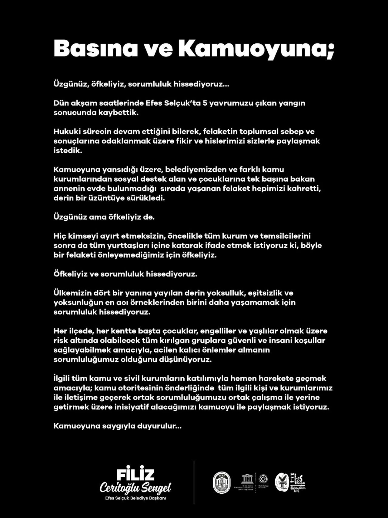 Başkan Filiz Ceritoğlu Sengel, açıklamasında, yangında kaybedilen 5 çocuğun acısını yaşadıklarını belirterek, "Efes Selçuk'ta yaşanan bu trajik yangın, hepimizi derinden sarstı. Hukuki süreç devam etmekle birlikte, bu felaketin toplumsal sebeplerine odaklanarak sorumluluklarımızı dile getirmek istedik" ifadelerini kullandı.