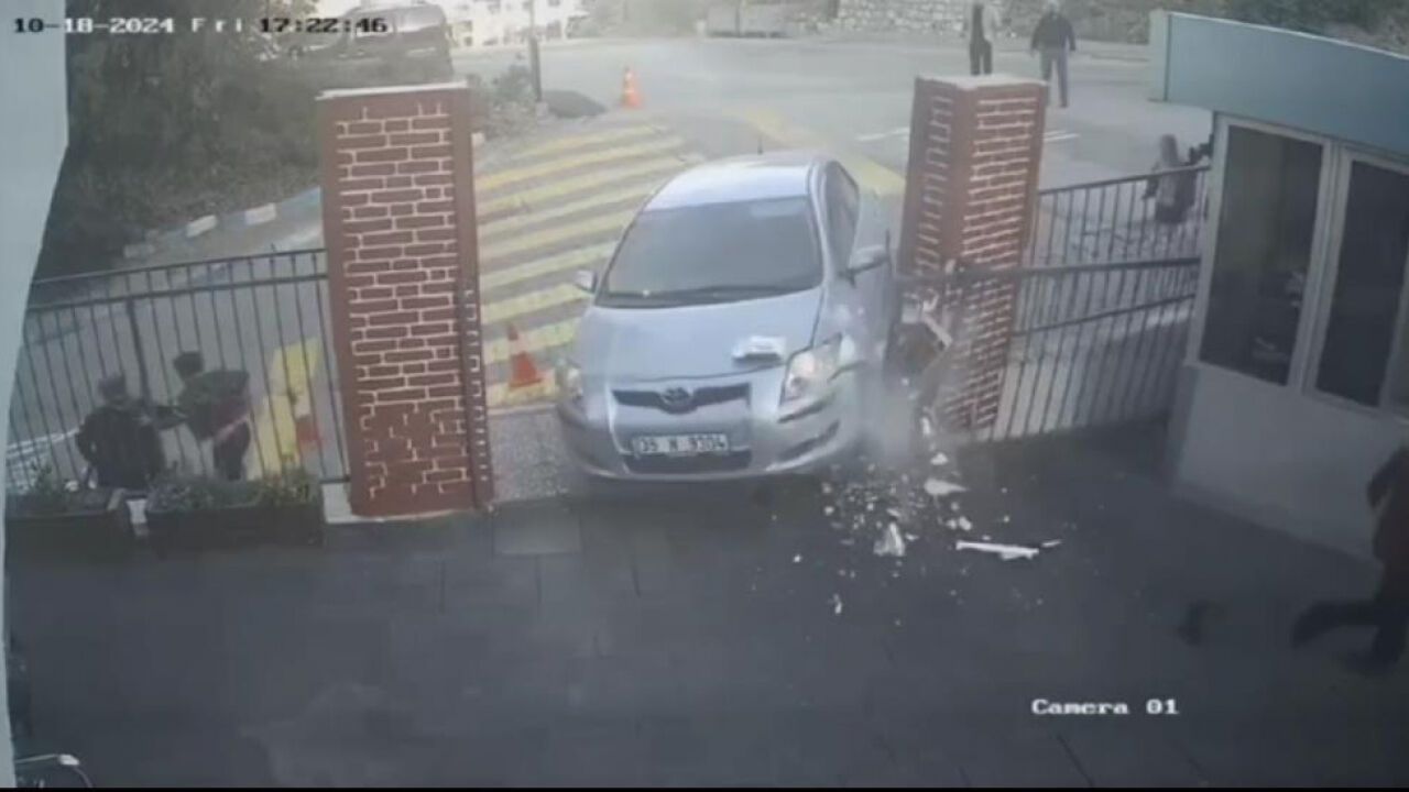 El freni çekilmeyen park halindeki bir otomobil, bir özel okulun bahçe kapısını kırarak içeri girdi. O esnada okulun önünde bulunan 2 çocuk ve 2 veli, bir öğretmenin uyarısıyla kazadan saniyelerle kurtuldu. Yaşanan bu anlar, okulun güvenlik kameralarına saniye saniye yansıdı.
