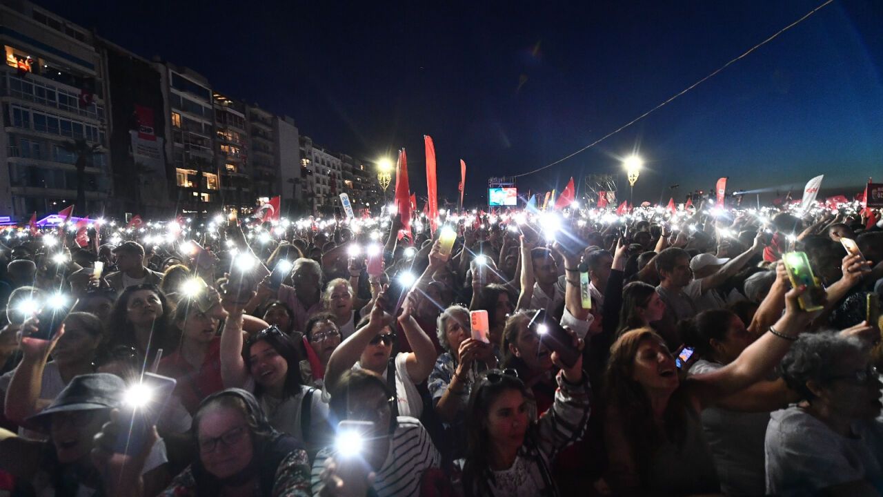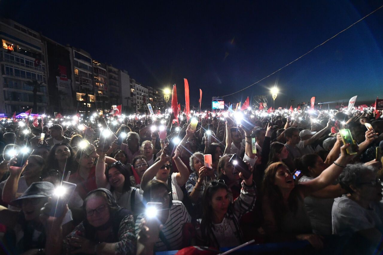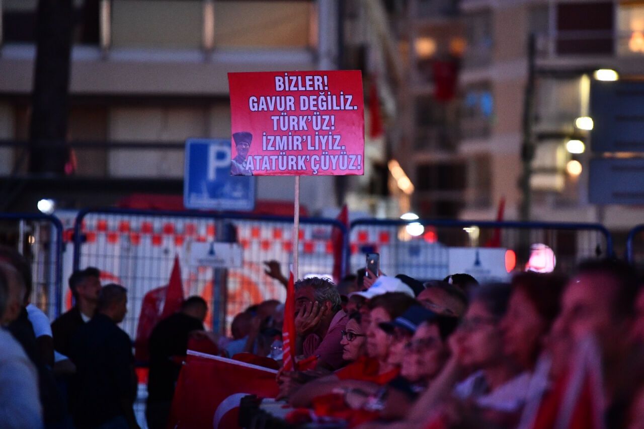 Işık gösterisi sırasında çalan “Yiğidim Aslanım” türküsü alandaki duyguyu zirveye taşıdı. İzmirliler hep bir ağızdan türküye eşlik etti. Kimi duygulandı, kimi gözyaşlarını tutamadı. Birlik ve beraberliğin en güçlü yansımalarından biri bu anlarda hissedildi.