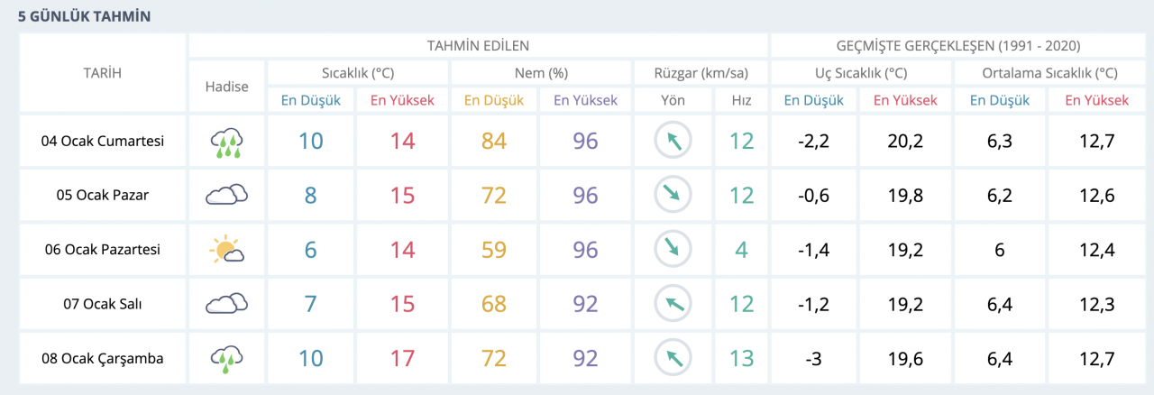 4 Ocak Cumartesi en yüksek ve en düşük sıcaklıklar