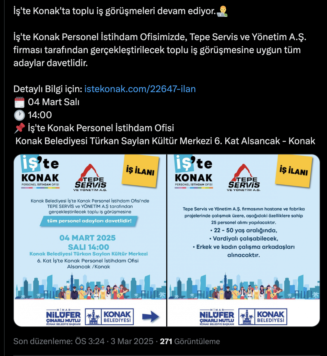Konak Belediyesi İş'te Konak Personel İstihdam Ofisi'nde TEPE SERVİS ve YÖNETİM A.Ş tarafından gerçekleştirilecek toplu iş görüşmesine tüm personel adayları davetlidir!
