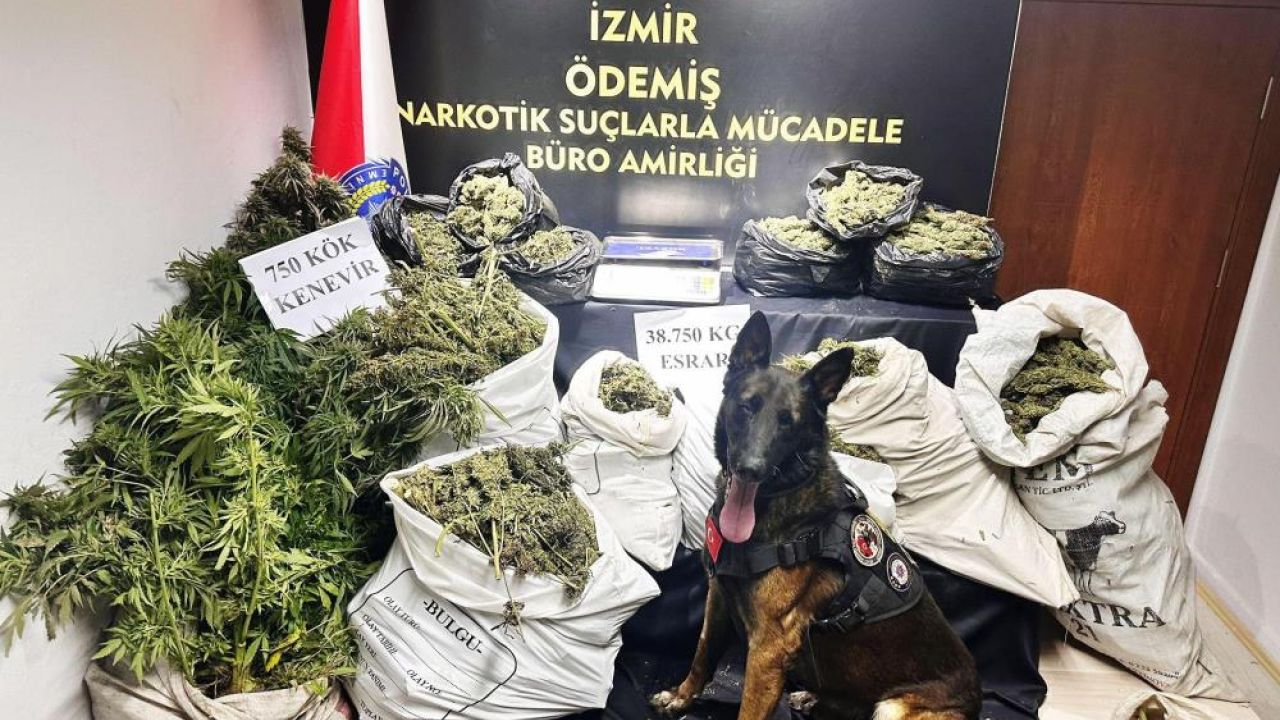 İzmir Narkotik Suçlarla Mücadele Şube Müdürlüğü, Ödemiş Narkotik Suçlarla Mücadele Büro Amirliği ve İstihbarat Şube Müdürlüğü ekipleri, ilçedeki bir hayvan damında uyuşturucu imalatı yapıldığına dair aldıkları ihbar üzerine savcılık koordinesinde operasyon düzenledi. Adreste yapılan aramalarda, 38 kilo 750 gram esrar, 749 kök kenevir bitkisi ve uyuşturucu madde tartımında kullanılan bir hassas terazi ele geçirildi. Operasyon kapsamında gözaltına alınan şüpheli, emniyetteki işlemlerinin ardından sevk edildiği mahkemece tutuklanarak cezaevine gönderildi.