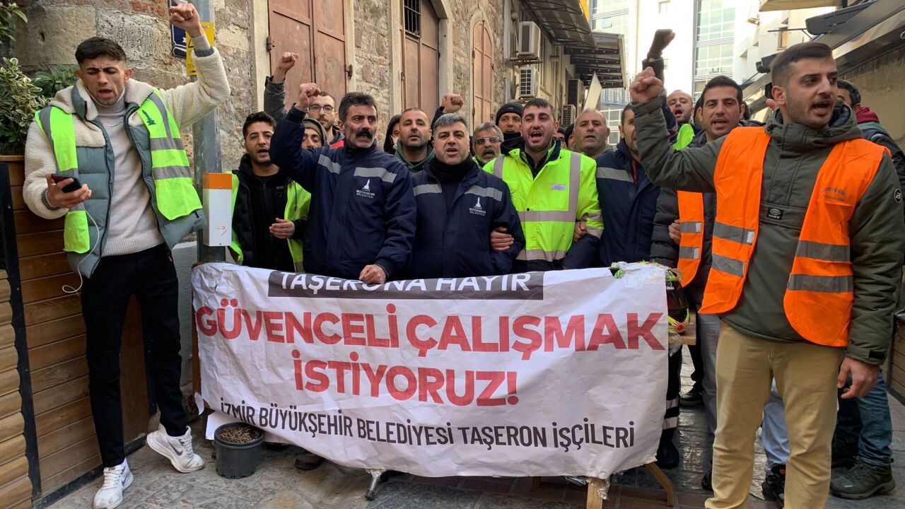 İzmir Büyükşehir Belediyesinin ihale ile işlettiği kent genelindeki tuvalet ve bebek bakım merkezlerinin temizliğini yapan taşeron işçilerinin sözleşmeleri sona erdi. Taşeron firmada sosyal haklarından mahrum çalışan işçileri ihalenin yeniden aynı firmaya verilmesine tepki göstererek iş bırakma kararı alarak greve çıktı.