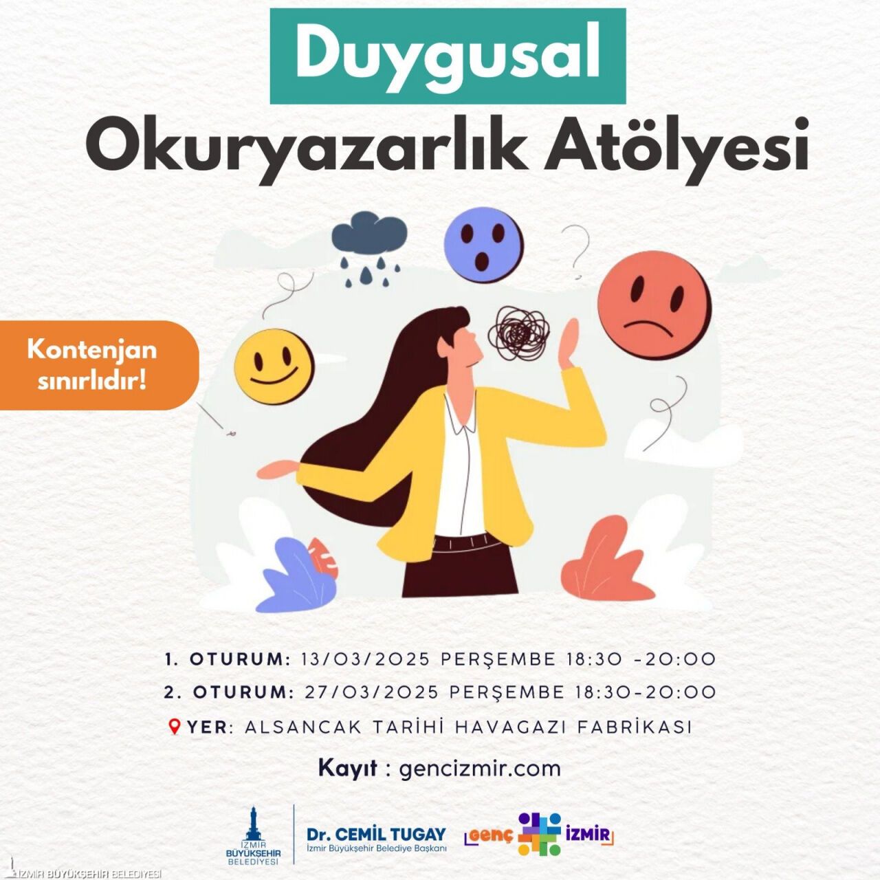 İzmir Büyükşehir Belediyesi internet sitesi üzerinden 15-30 yaş aralığı için ücretsiz düzenlediği etkinliklere Duygusal Okuryazarlık Atölyesi ve Umut Atölyesi ekleyerek duyuruda bulundu.