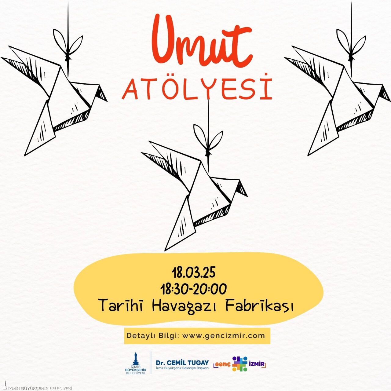 Umut Atölyesi’nde ise gençler umut üzerine konuşup umudun ifade ettiklerini yaratıcılıklarıyla masaya yatıracak. Her bir genç, umudun gücüyle içlerindeki yaratıcı ve iyileştirici yanları keşfedecek. Umut Atölyesi, 18 Mart Salı günü 18.30-20.00 saatleri arasında Tarihi Havagazı Fabrikası’nda gerçekleşecek.