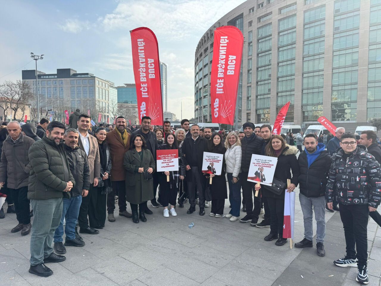 İmamoğlu içeride ifade verirken, destekçileri Çağlayan Adliyesi önüne akın etti. CHP İzmir heyeti de tam kadro İstanbul’a giderek İmamoğlu’na destek verdi.