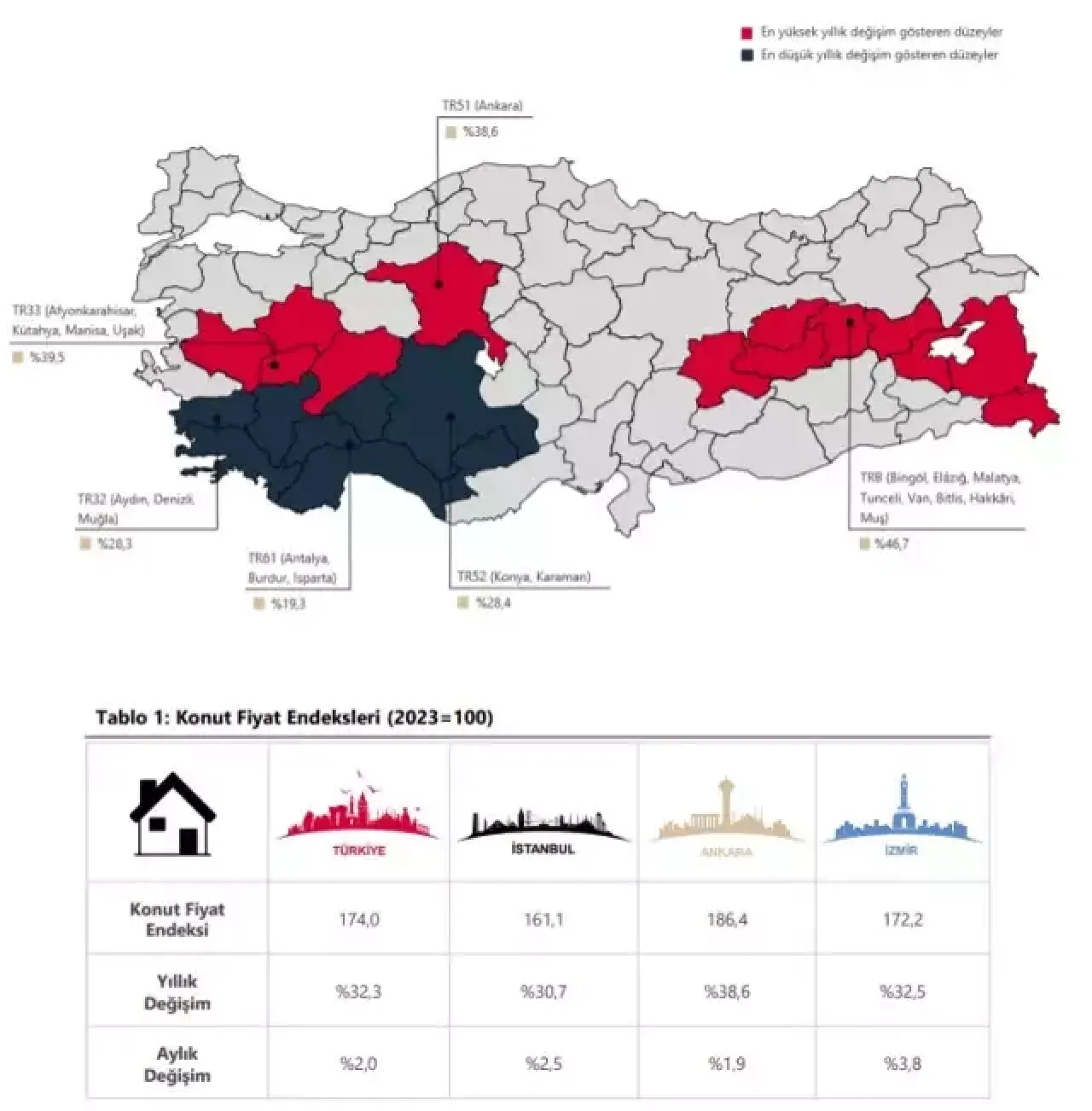 Konut fiyatlarındaki en büyük artış Bingöl, Elazığ, Malatya, Tunceli, Van, Bitlis, Hakkari ve Muş'ta yüzde 46,7 oranında artış gösterirken İzmir, Ankara ve İstanbul'da da artışlar belli oldu.