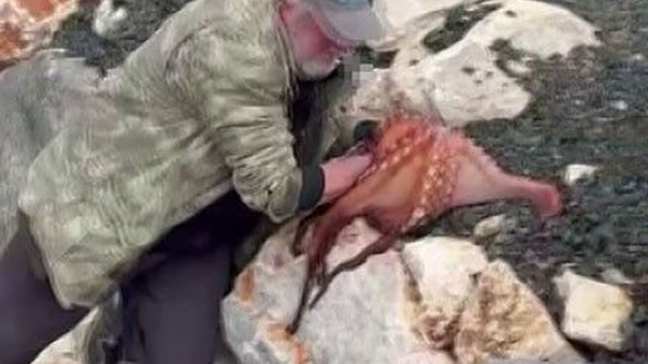 İzmir’in Karaburun ilçesinde kayalıklarda görülen ahtapot, bir balıkçı tarafından elleriyle yakalanarak denizden çıkarıldı. O anlar cep telefonu kamerasıyla kaydedildi.