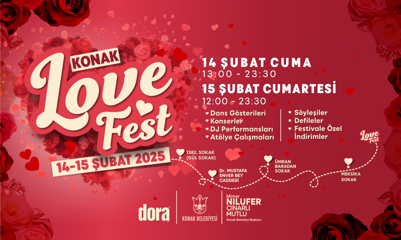 Konak’ın kalbinde, Alsancak’ta düzenlenecek olan Love Fest, 14-15 Şubat tarihlerinde müzik ve eğlencenin merkezi olacak. 13.00-23.30 saatleri arasında sürecek festival, dans gösterileri, konserler, DJ performansları, defileler ve söyleşiler gibi birbirinden farklı etkinlikleri İzmirlilerle buluşturacak. Ayrıca, festivale özel mağazalar gece yarısına kadar açık olacak ve katılımcılara özel indirimler sunulacak.