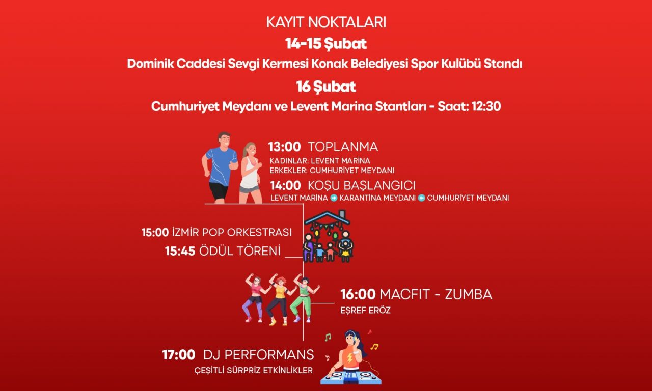 Sevdiğine Koş etkinliği, Konak’ın en renkli etkinliklerinden biri olarak, hem eğlenceli hem anlamlı bir anı yaşatacak. Koşuya katılmak isteyenler, 14-15 Şubat tarihlerinde Dominik Caddesi’nde önceden kayıt yaptırabilecek. Ayrıca, etkinlik günü de başlangıç noktalarından kayıt alınabilecek.