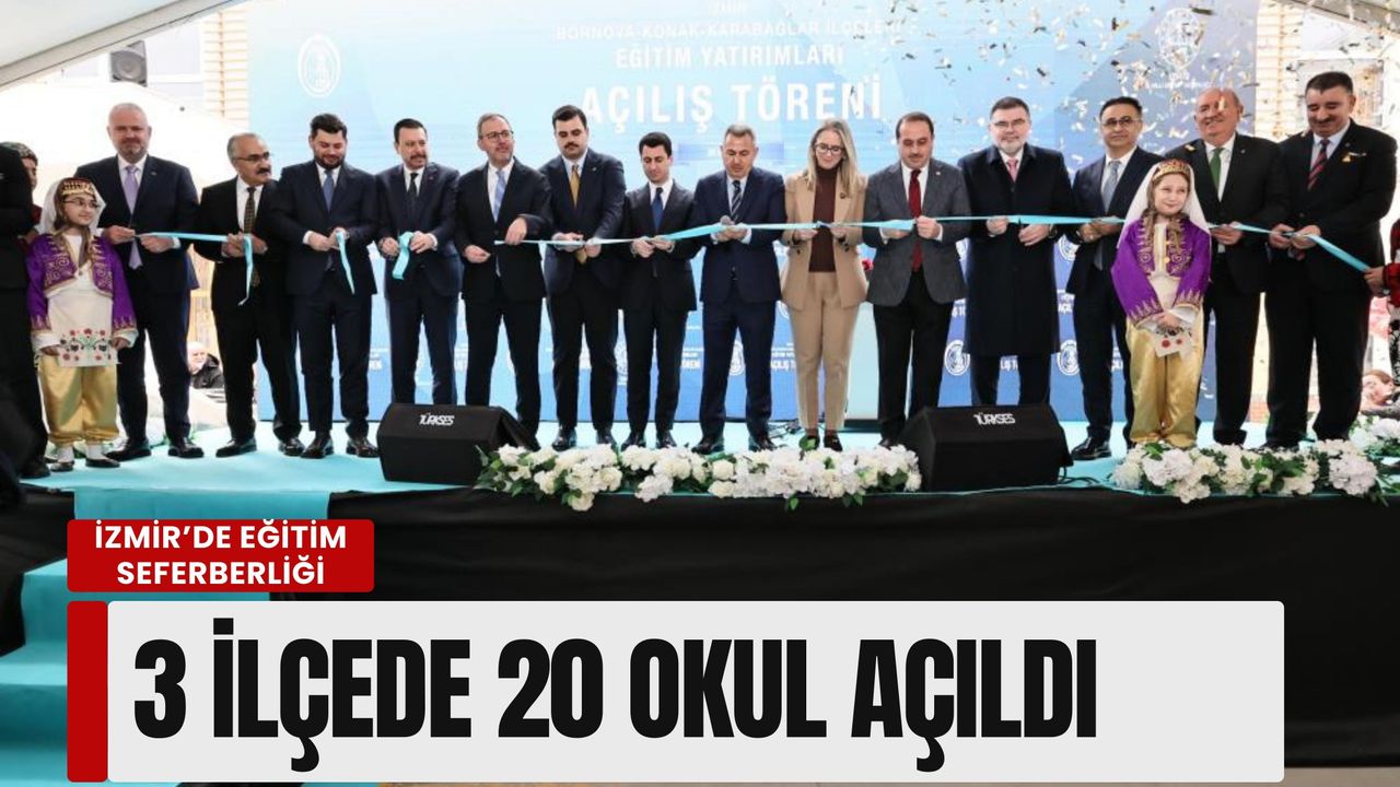 İzmir’de eğitim altyapısını güçlendirmek amacıyla Bornova, Konak ve Karabağlar ilçelerinde inşası tamamlanan 20 okul için toplu açılış töreni gerçekleştirildi. Törene İzmir Valisi Süleyman Elban, İl Milli Eğitim Müdürü Ömer Yahşi ve AK Parti İzmir Milletvekillerinin yanı sıra çok sayıda siyasi isim katılım sağladı.