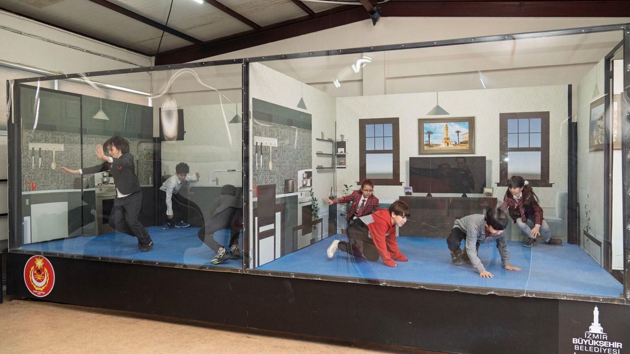 İzmir Büyükşehir Belediyesi’nin Buca’daki eğitim merkezinde kullanılan sanal gerçeklik simülasyonu, yurttaşlara deprem anını güvenli ortamda deneyimleme imkânı sunarak doğru refleksleri kazandırmayı amaçlıyor.