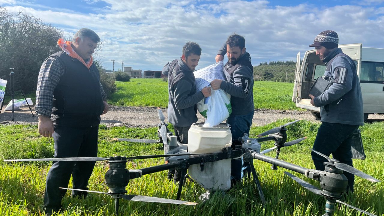 Sağanak sonrası ağır araçların araziye girememesi nedeniyle üreticiler, geniş alanlardaki mahsulleri havadan gübreleyerek hem zamandan tasarruf etti hem de ürün kaybının önüne geçti.