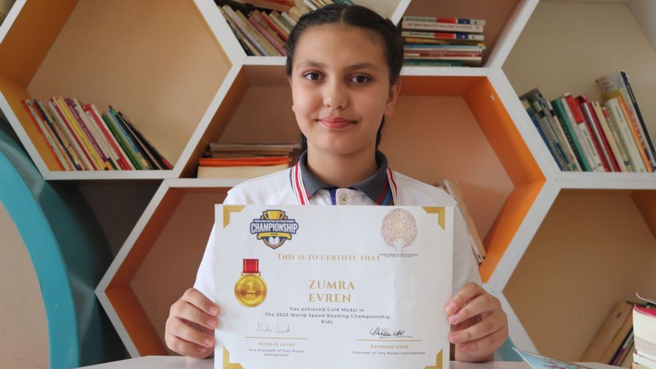Dünya şampiyonu olan Zümra Evren, “Annem küçüklüğümden beri okumam için bana hep kitap alırdı. İlkokulda Yıldırım öğretmenin kitap okuma alışkanlığımı ilerletti ve bu sayede kitap okuma alışkanlığım oluştu. Ben almak istediğim kitapları teyzeme söylüyordum ve teyzem de benim için sipariş ediyordu. Böylece kitapları ve okumayı çok sevmeye başladım. Daha sonraki süreçte hızlı okuma için bir kursa kayıt oldum. Ardından yarışmaya katılmaya karar verdik. Benim için çok heyecanlıydı ve biraz stres de vardı. Yapabilir miyim ya da süreyi yetiştirebilir miyim diye düşünüyordum. Yarışmaya Fransa, Lüksemburg, Polonya, İngiltere gibi çeşitli ülkelerden öğrenciler katılmıştı. Yarışmaya girdiğimde karşıma 23 sayfalık metin bulunan bir kitap çıktı. Onu 20 dakikada okumaya çalıştım. Ardından metinle ilgili 8 soru geldi ve o 8 soruyu okuduğum metine göre cevaplamam gerekiyordu. Hem verilen süre içerisinde metini okudum hem de sorulan soruların tümüne doğru cevap vererek birinci oldum ve madalyayı aldım. Böylelikle dünya birincisi oldum. Sonuçlar açıklanınca çok şaşırmıştım. Sırtımdan büyük bir yük kalkmış gibi oldu. Birinci olmayı beklemiyordum. Çünkü ben bu yarışmaya kendimi denemek için girmiştim” ifadelerini kullandı.