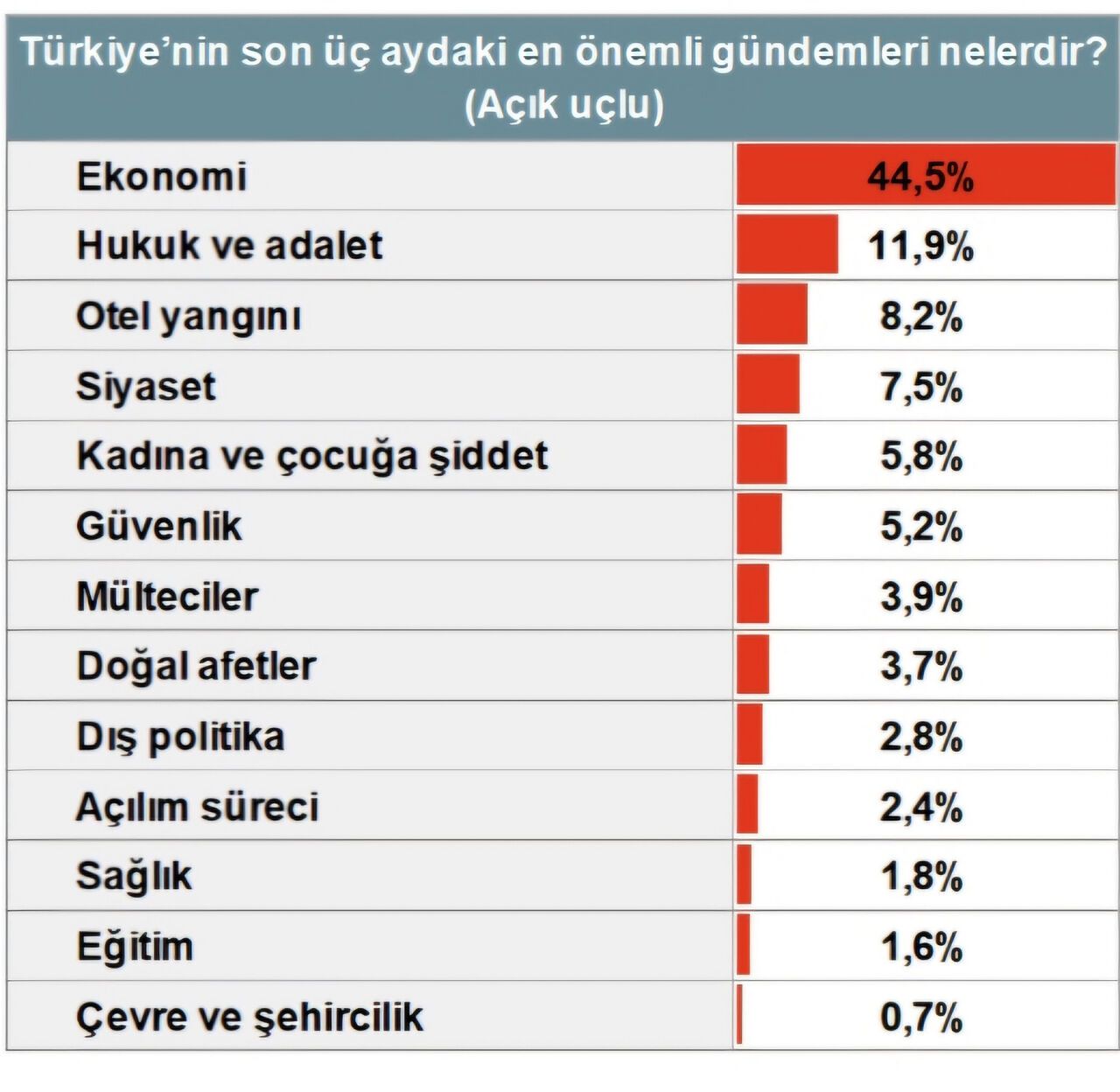 Katılımcılara göre Türkiye’nin son üç ayda en önemli gündem açık ara farkla (%44,5) ekonomi. Ekonominin ardından hukuk-adalet, sonra Ocak ayında Kartalkaya’da gerçekleşen otel yangını geliyor. Ancak ekonomi ve geçim sıkıntısı %44,5 oranla İzmrliler için çok önemli. Yoksulluğun en yakıcı gündem olarak kendini dayattığı yapılan odak grup görüşmelerinde de ortaya konuyor. Kadınlar gündelik misafirliklerinde dahi geçim zorluğunun en baskın sohbet konusu haline geldiğini anlatıyor. Araştırmaya katılan kadınlar, "Eskiden ev oturmalarında dedikodu yapılırdı ama şimdi hep geçim muhabbeti. Kiraya ne kadar zam gelecek gibi kaygılar yaşıyoruz. Başka bir muhabbetimiz yok. Herkes geçim konuşuyor. Eskiden daha güzel, güncel şeylerden konuşma şansımız vardı" diye konuşuyor.