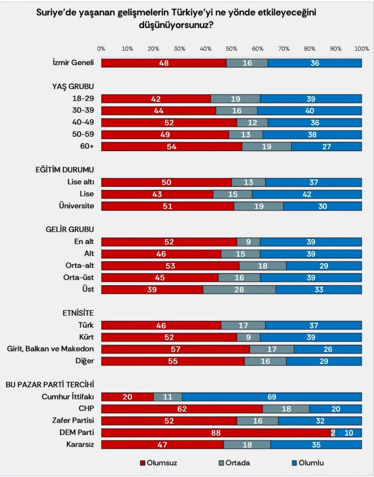 Suriye’deki gelişmelerin Türkiye’ye yansımaları konusunda daha az negatif görüş bildirenler 18-29 yaş aralığındaki gençler, lise mezunları, üst gelir grubu ve Cumhur İttifakı seçmenleri.