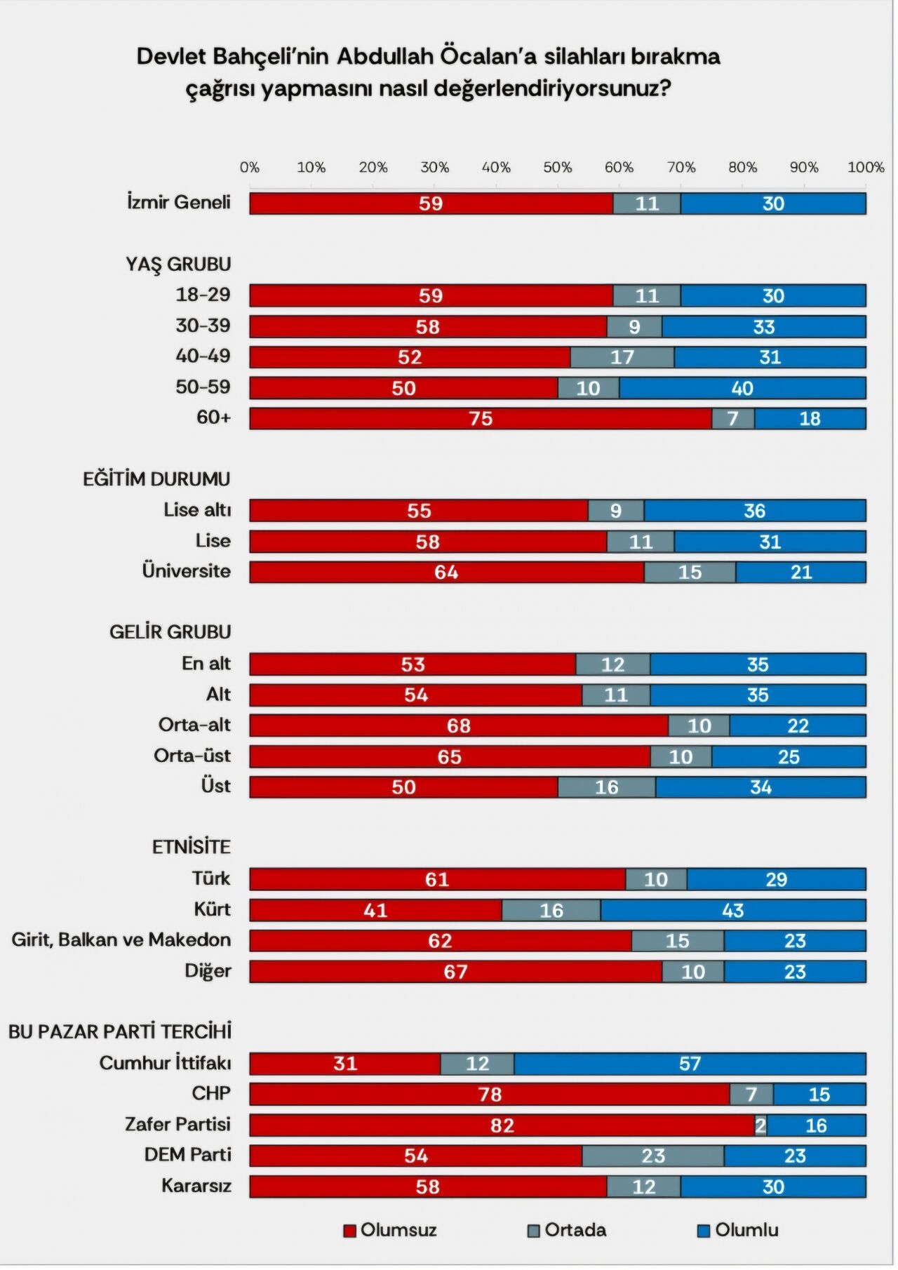 Eğitim düzeyi arttıkça katılımcıların Bahçel’nin silah bırakma çağrısını negatif yorumlama eğilimi de artıyor. Bahçeli’nin çağrısını en pozitif yorumlayanların orta gelir grupları, düşük eğitim düzeyine sahip katılımcılar, kendisini Kürt olarak tanımlayanlar ve Cumhur İttfakı seçmenleri olduğu görülüyor. Bu çağrıya en olumsuz yaklaşanlar ise %82 ile Zafer Partisi ve %78 iile CHP seçmenleri.