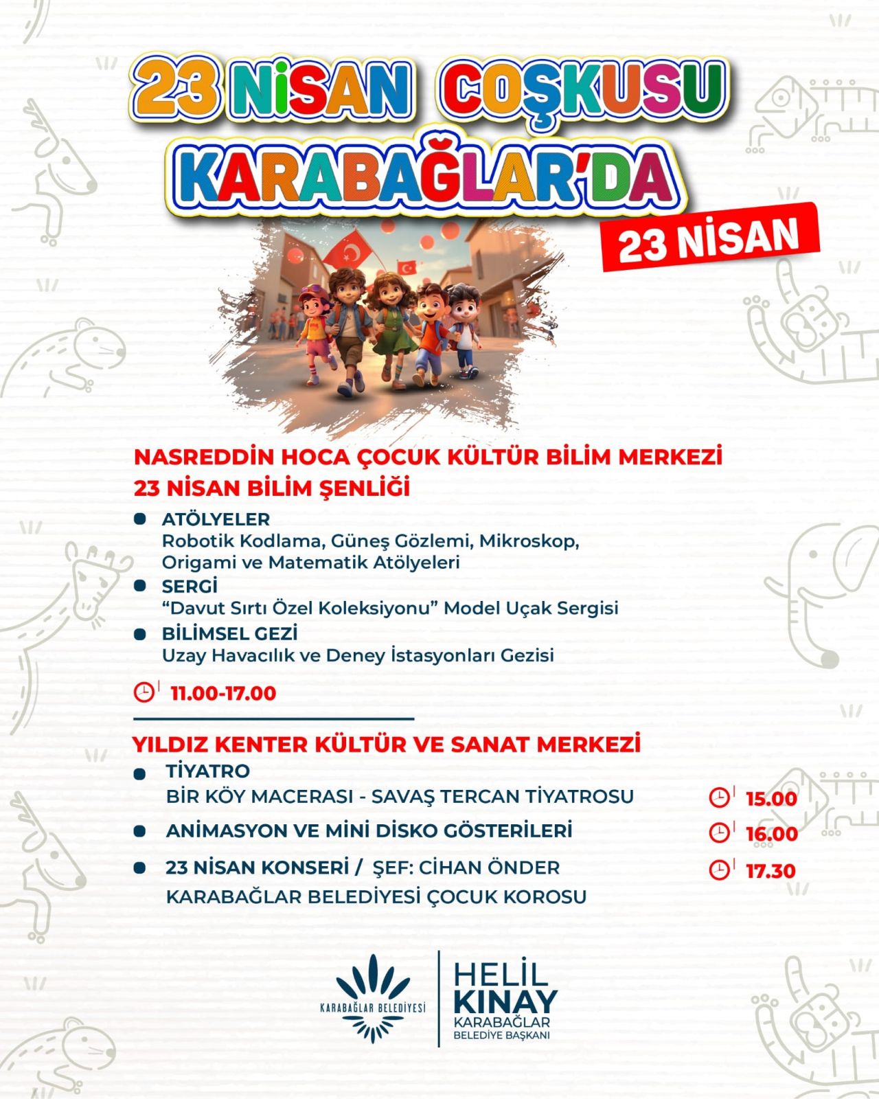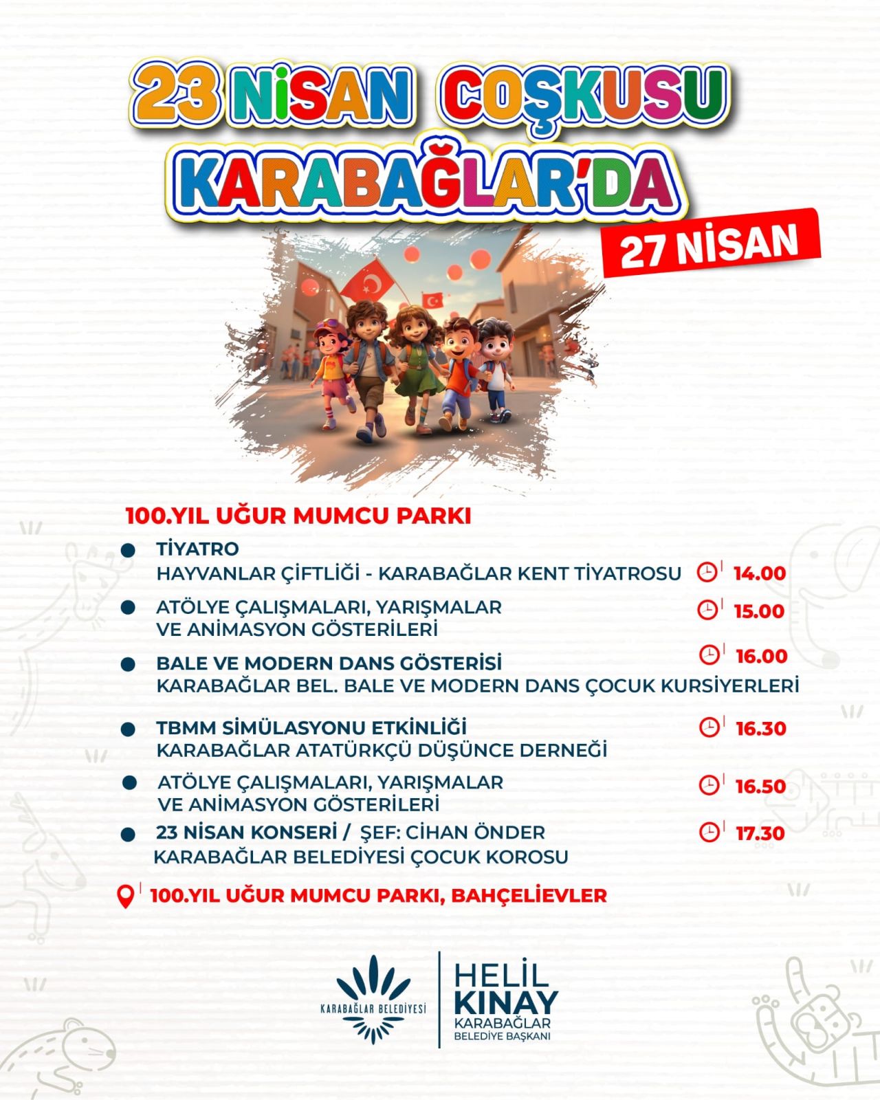 Karabağlar Belediyesi tarafından hazırlanan zengin içerikli program, 27 Nisan’a kadar ilçenin farklı noktalarında çocuklara ve ailelerine bayram heyecanını yaşatacak.