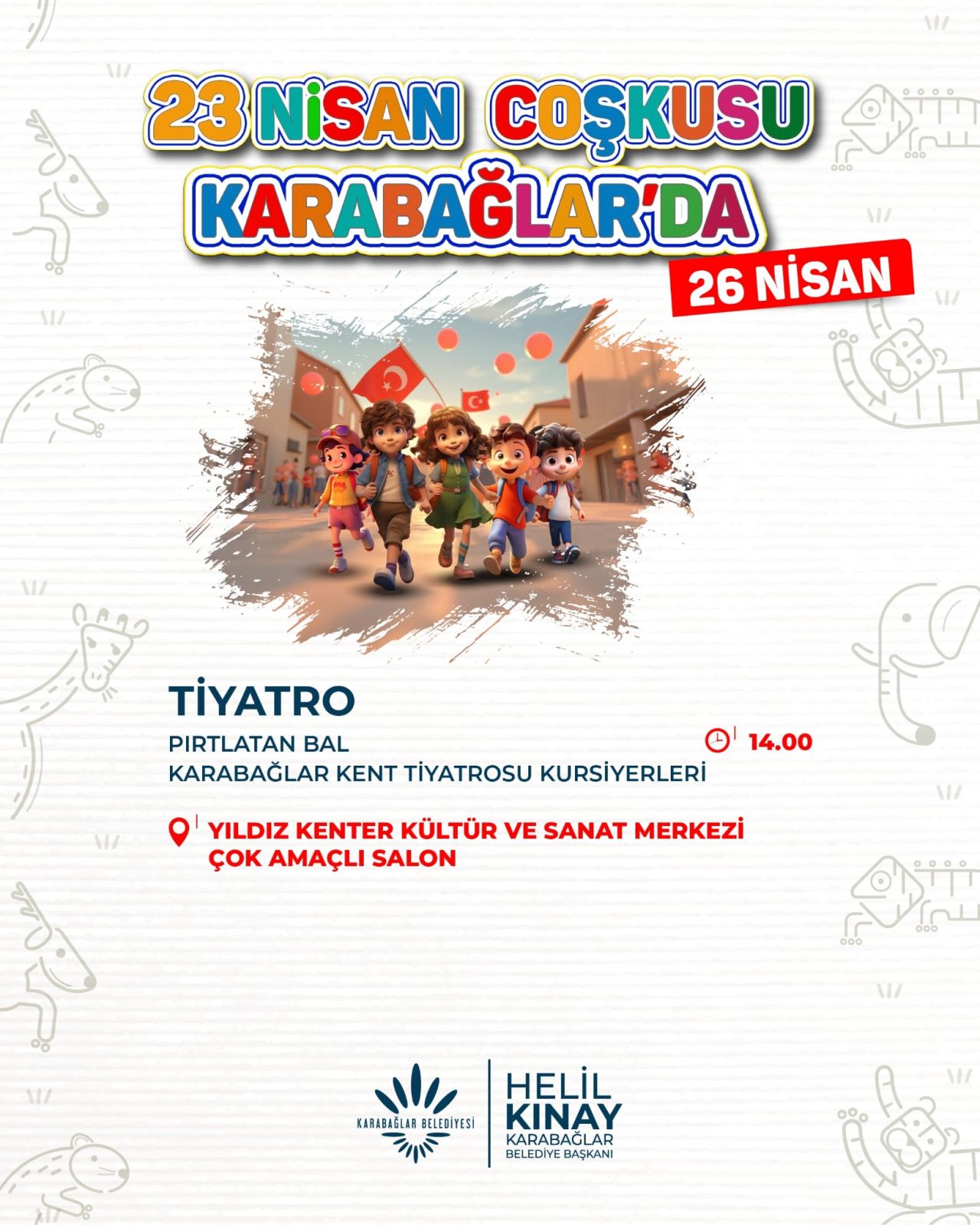 Hafta sonu etkinlikleri ise 26 Nisan Cumartesi günü sahneye taşındı. Yıldız Kenter Kültür ve Sanat Merkezi’nde Karabağlar Kent Tiyatrosu kursiyerlerinin sahnelediği “Pırlatan Bal” oyunu çocuklara eğlenceli anlar yaşattı.