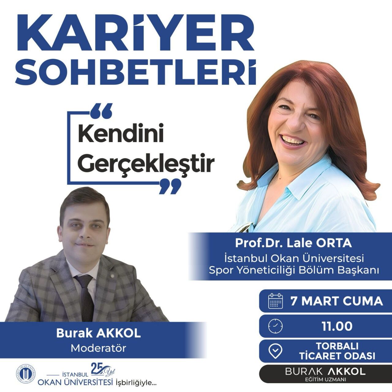 Burak AKKOL, “Bu yılki Kariyer Sohbetleri programımızın ikinci konuğu, ülkemizin önde gelen isimlerinden Prof. Dr. Lale ORTA. Kendisi, futbolun ilk kadın antrenörü ve Türkiye liglerinde maç anlatan ilk kadın spor spikeri olarak önemli bir kariyere sahiptir” dedi. Ayrıca, Prof. Dr. ORTA’nın 11 yıl boyunca uluslararası hakemlik yaptığını ve 150 uluslararası maçı yönettiğini belirten AKKOL, bu özel etkinlik ile Torbalı’daki sınav hazırlığı içindeki gençlere önemli kariyer tavsiyeleri vereceğini ifade etti.