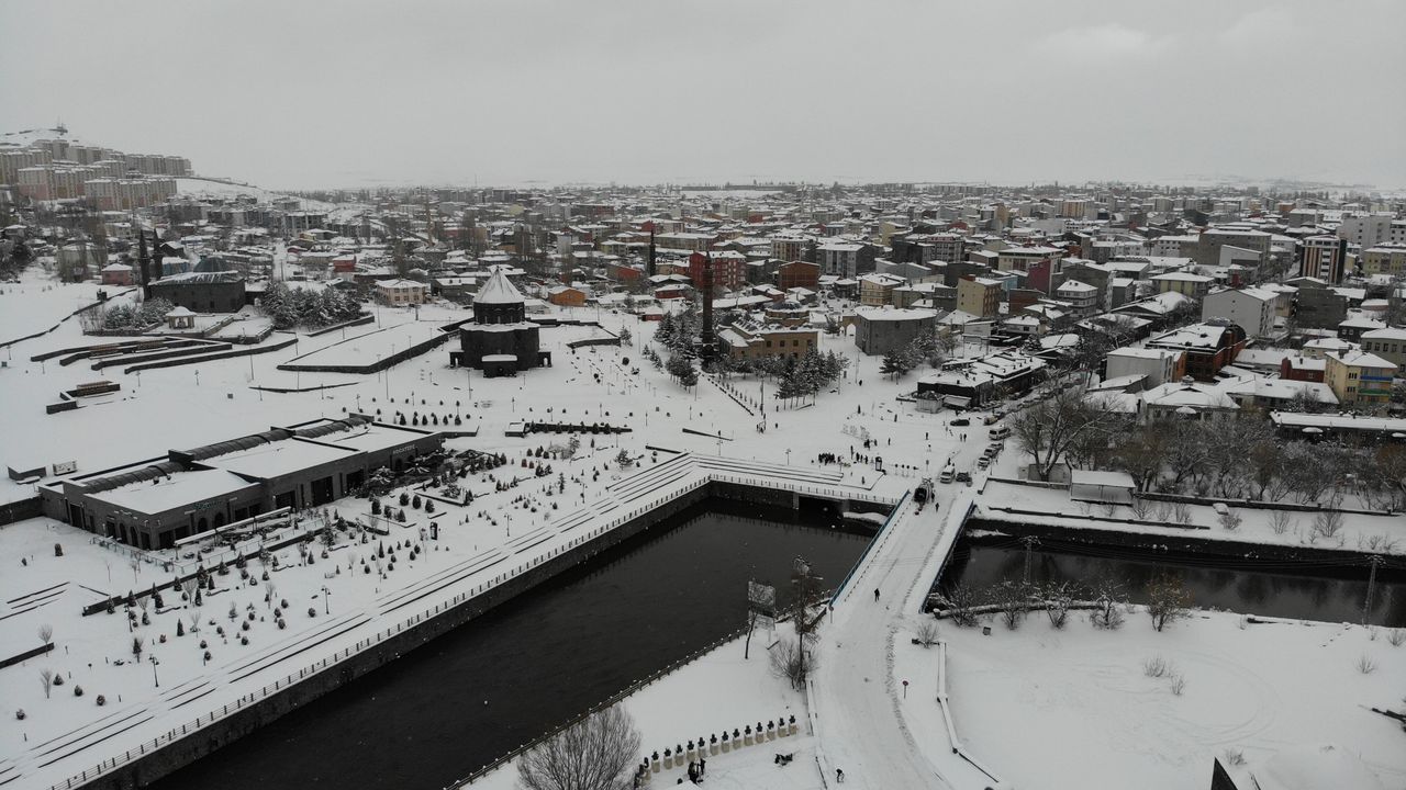 Dron ile havadan çekilen görüntülerde şehrin adeta beyaz gelinlik giydiği görüldü. Zorlu kış şartlarına rağmen ortaya çıkan manzara görenleri büyüledi.