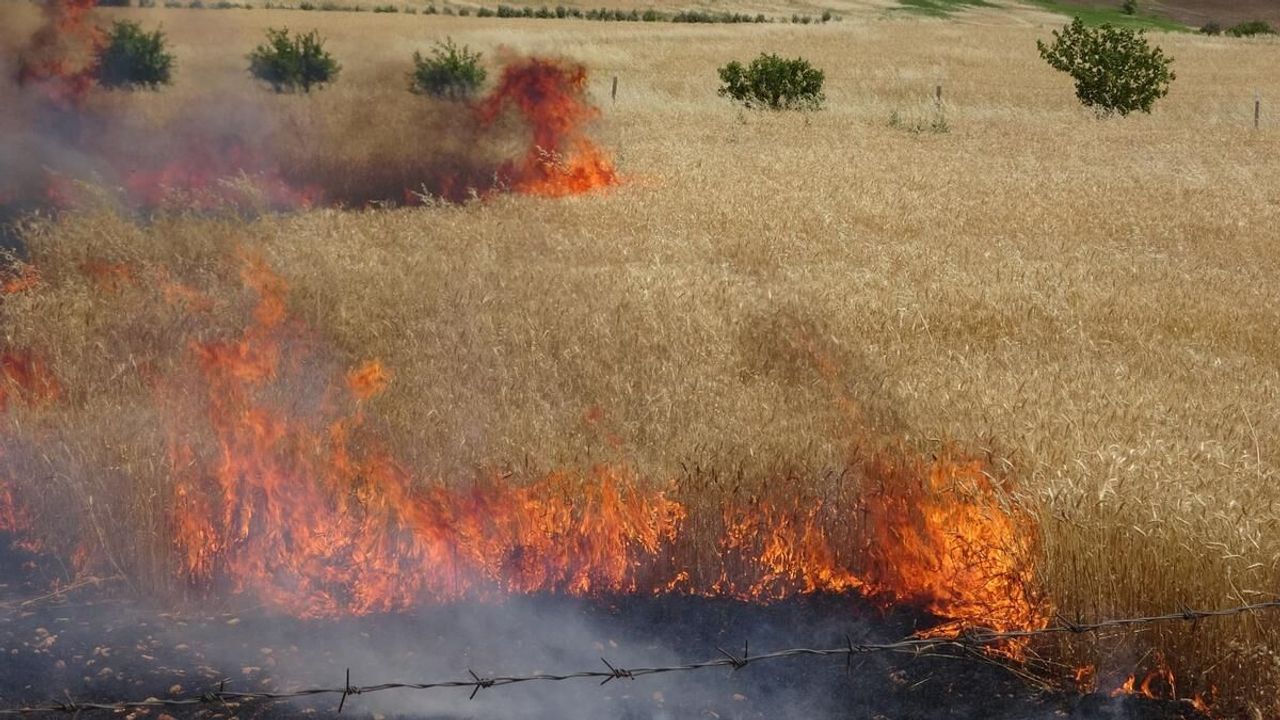Adıyaman’da otomobilin çarptığı elektrik direğinin devrilmesi sonucu buğday tarlalarında çıkan yangını söndürmek isteyen köylüler canla başla mücadele etti. Çevresi alev topuna dönen sürücü son anda kurtuldu.