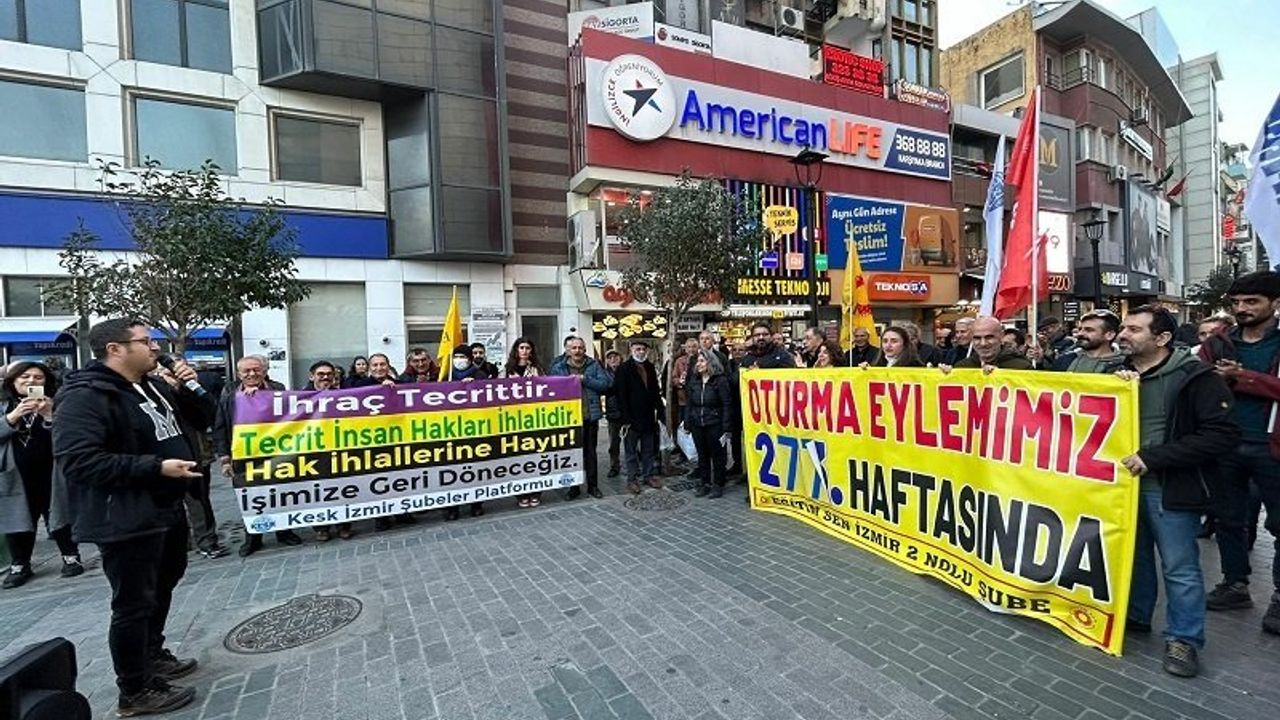 Kamu Emekçileri Sendikaları Konfederasyonu’na (KESK) bağlı Eğitim ve Bilim Emekçileri Sendikası (Eğitim-Sen) İzmir 2 No’lu Şube’nin KHK’ler ihraç edilen kamu emekçilerinin işe iade edilmesi talebiyle başlattığı oturma eylemi 277. haftasında da sürdü. Karşıyaka İskelesi’nde yapılan oturma eyleminde, “İhraç tecrittir, tecrit insan hakları ihlalidir. Hak ihlaline hayır! İşimize geri döneceğiz” pankartı açıldı.