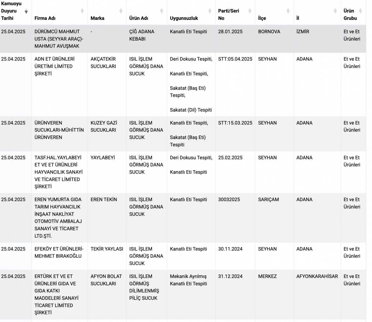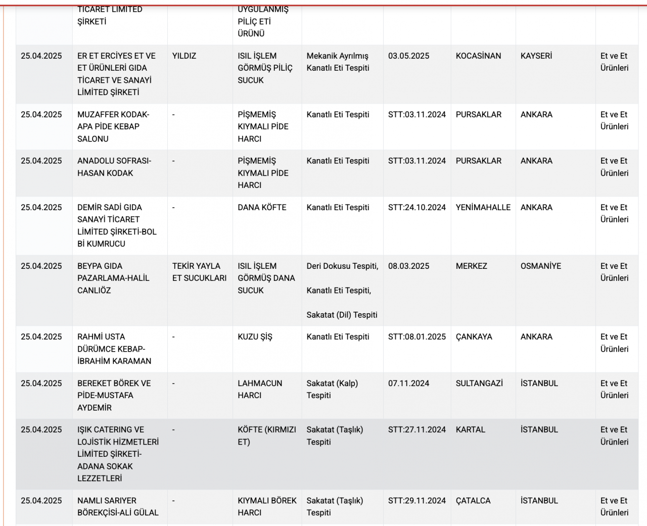25.04.2025 IŞIK CATERING VE LOJİSTİK HİZMETLERİ LİMİTED ŞİRKETİ-ADANA SOKAK LEZZETLERİ - KÖFTE (KIRMIZI ET) Sakatat (Taşlık) Tespiti STT:27.11.2024 KARTAL İSTANBUL Et ve Et Ürünleri 25.04.2025 NAMLI SARIYER BÖREKÇİSİ-ALİ GÜLAL - KIYMALI BÖREK HARCI Sakatat (Taşlık) Tespiti STT:29.11.2024 ÇATALCA İSTANBUL Et ve Et Ürünleri