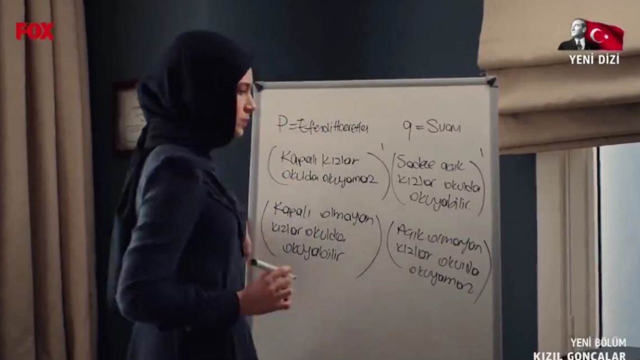 Beyaz tahtada Suavi’ye mantık önermesini konusunu anlatan Zeynep, kapalı kızların okutulmadığı zihniyete dikkat çekti.
