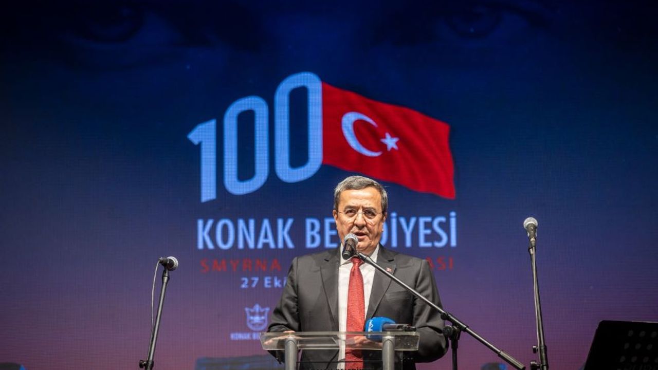 Konak Belediye Başkanı Abdül Batur, Cumhuriyet’in 100’üncü yılını kutladığı konuşmasında, Mustafa Kemal Atatürk’ün ve Türkiye Cumhuriyeti’nin vazgeçilmez olduğunu vurgulayarak, “Yüz yıl önce, takvimler 28 Ekim 1923’ü gösterdiğinde Gazi Mustafa Kemal Atatürk, meclisten çıkarken ‘Arkadaşlar, yarın Cumhuriyet’i ilan edeceğiz’ diyerek vermişti o büyük müjdeyi. 29 Ekim 1923 günü Cumhuriyet’i ‘Hakimiyet, kayıtsız şartsız milletindir’ sözüyle ilan etti. Anadolu halkı hürriyetini, bir daha kaybetmemek üzere kazandı. Mustafa Kemal Atatürk önderliğinde kurulan yeni Türkiye Cumhuriyeti adeta küllerinden doğdu. Ey büyük Atatürk, bugün bizlere emanet ettiğin Cumhuriyet tam yüz yaşında. Yüz yıldır bitmeyen, giderek artan bir aşkla bağlıyız emanetine. Demokrasinin, çağdaş hukukun, eşit birey olmanın, özgürlüğün ve barışın güvencesi Cumhuriyet’e sahip çıkmaya devam ediyoruz. Cumhuriyet’i siz kurdunuz, onu yüceltecek ve koruyacak olan bizler bu görevden asla vazgeçmeyeceğiz. Çünkü Cumhuriyet demek özgürlük demektir, gelecek demektir, umut demektir. Cumhuriyet Kuvayımilliyedir. Cumhuriyet tam bağımsız laik Türkiye’dir. Cumhuriyet demokrasidir, barıştır, adalettir, bilimdir, modernliktir. Cumhuriyet bizim için vazgeçilmezdir, Cumhuriyet Atatürk’tür” ifadelerini kullandı.