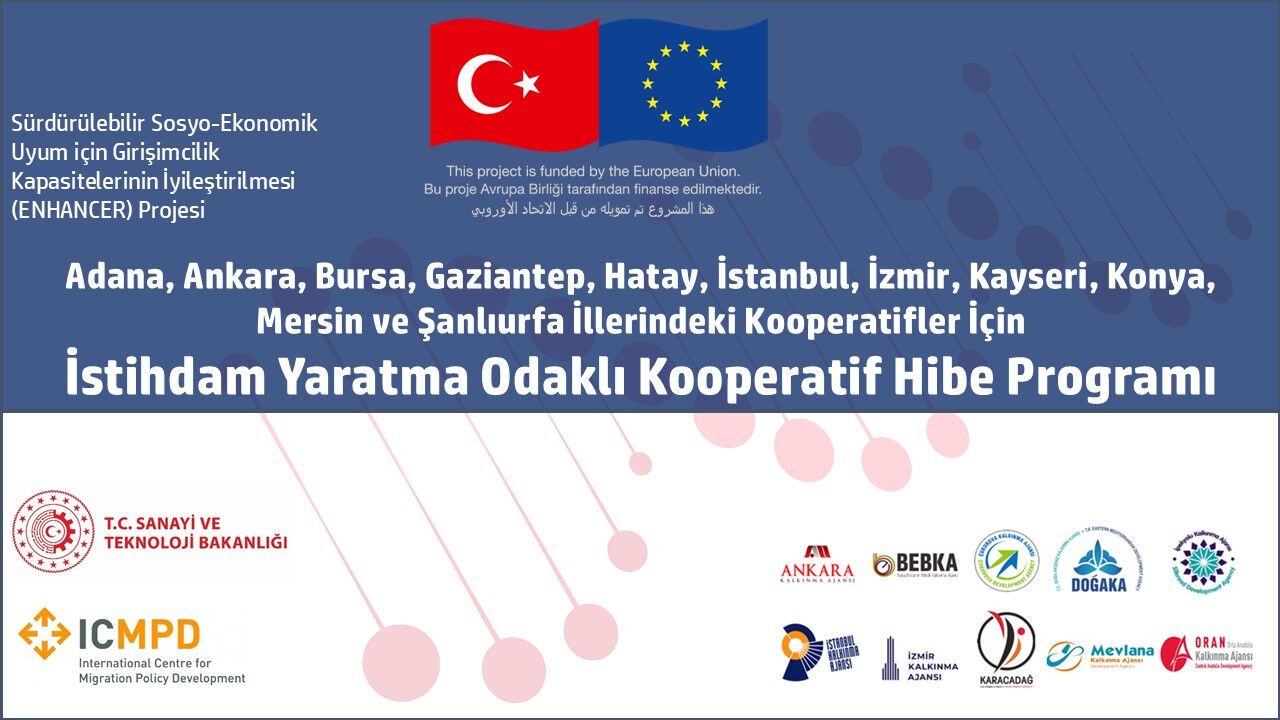 Avrupa Birliği'nin finanse ettiği, ICMPD Uluslararası Göç Politikaları Geliştirme Merkezi tarafından, T.C Sanayi ve Teknoloji Bakanlığı Kalkınma Ajansları Genel Müdürlüğü koordinasyonuyla yürütülen Sürdürülebilir Sosyo-Ekonomik Uyum için Girişimcilik Kapasitelerinin İyileştirilmesi (ENCHANCER) Projesi kapsamında uygulanan İstihdam Yaratma Odaklı Kooperatif Hibe Programı çağrılarının üçüncüsü açıklandı.