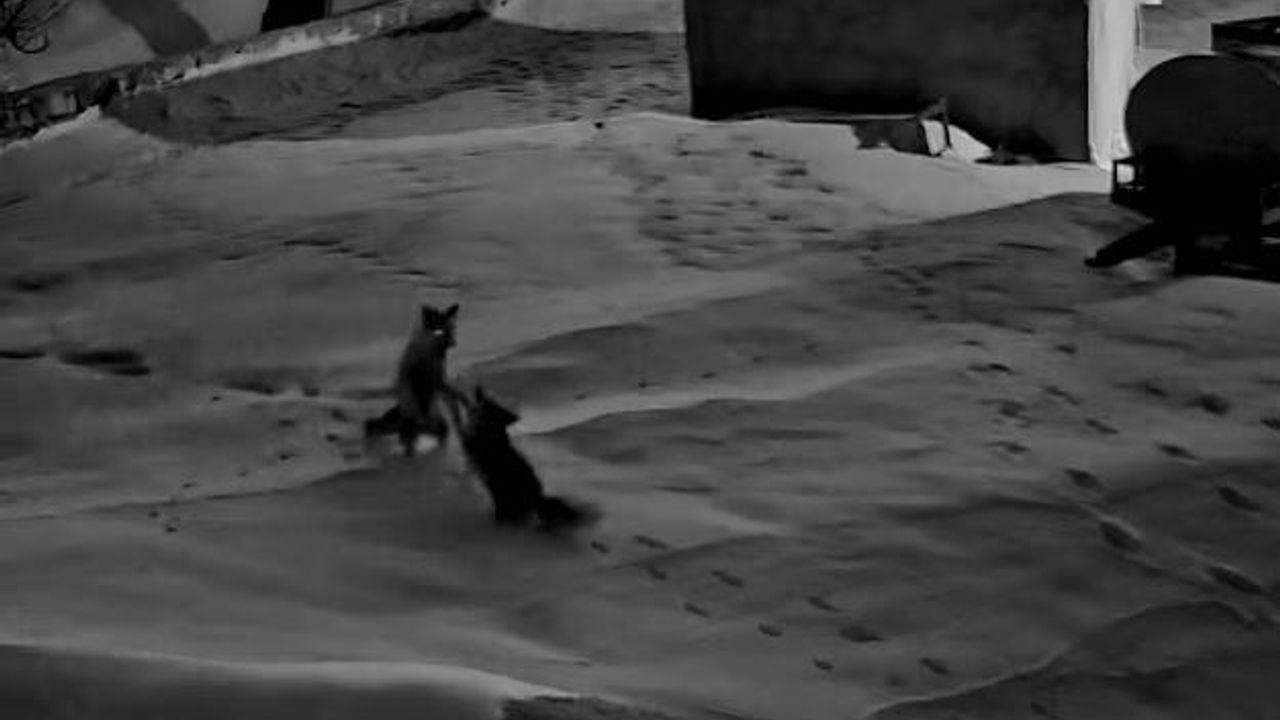 Görüntüleri izleyen Şimşek, evinin önünde yiyecek arayan iki tilkinin kadraja girdiğini fark etti. Bir süre bölgede dolaşan tilkiler, aniden birbirleriyle kavga etmeye başladı. Kar üzerinde yaşanan mücadele kısa süre devam ettikten sonra tilkiler bölgeden uzaklaştı.