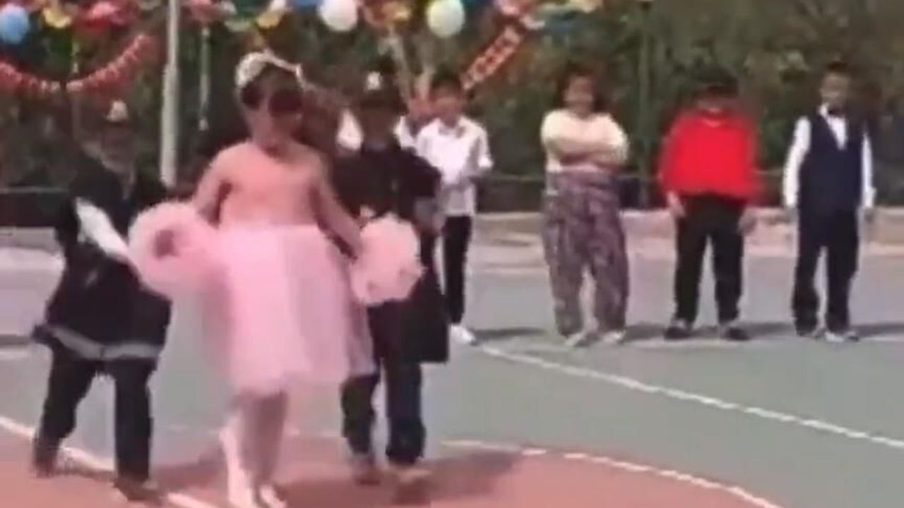 Hangi şehir ve okulda yapıldığı bilinmeyen müsamerede Dilan Polat’ın ‘Enerci’ adlı şarkısı çalınırken polis kıyafetli bir erkek ve bir kız çocuğu, alanda dans eden arkadaşlarını gözaltına aldı.