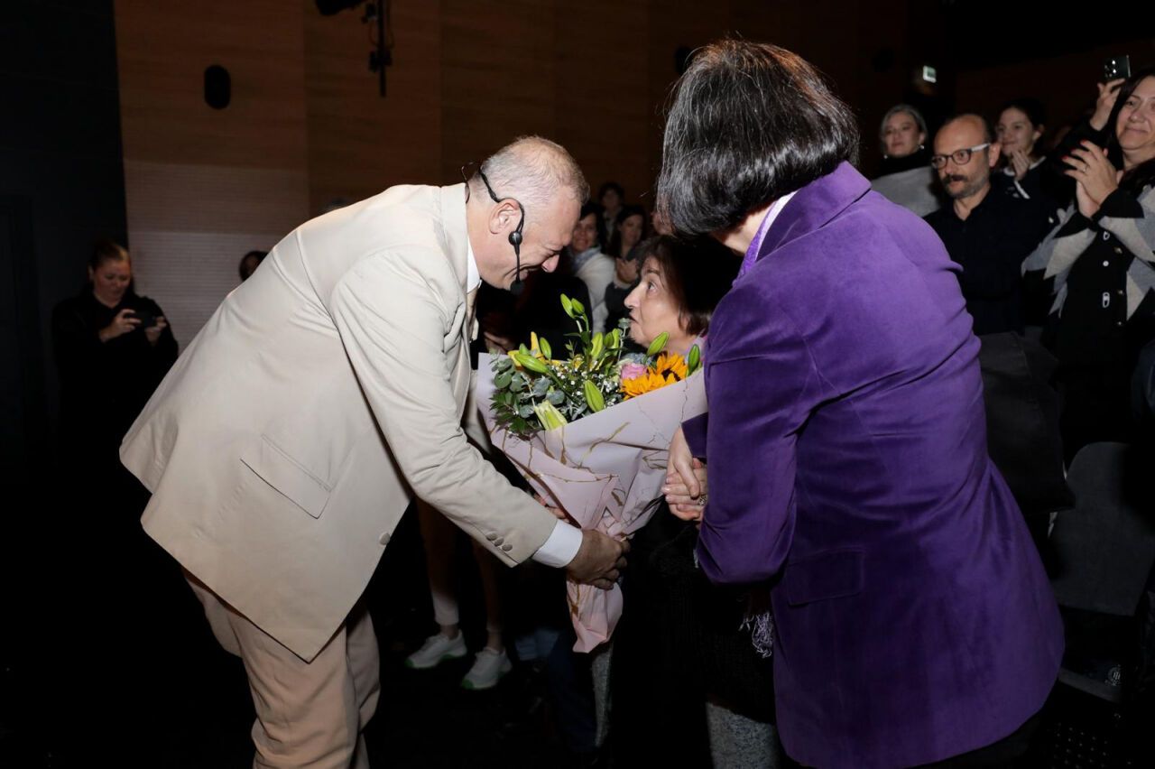 Oyunun ardından sahneye çıkan İzmir Büyükşehir Belediyesi Genel Sekreter Yardımcısı Prof. Dr. Pınar Okyay, usta oyuncu Levent Üzümcü'ye teşekkür ederek çiçek takdim etti. Üzümcü, aldığı çiçeği lise yıllarında kendisine edebiyat öğretmenliği yapan Sevgi Tetik'e sunarak salonda duygu dolu anlar yaşanmasına neden oldu. Eğitimciler, oyunu ayakta alkışlayarak bu özel gösterimi unutulmaz kıldı.