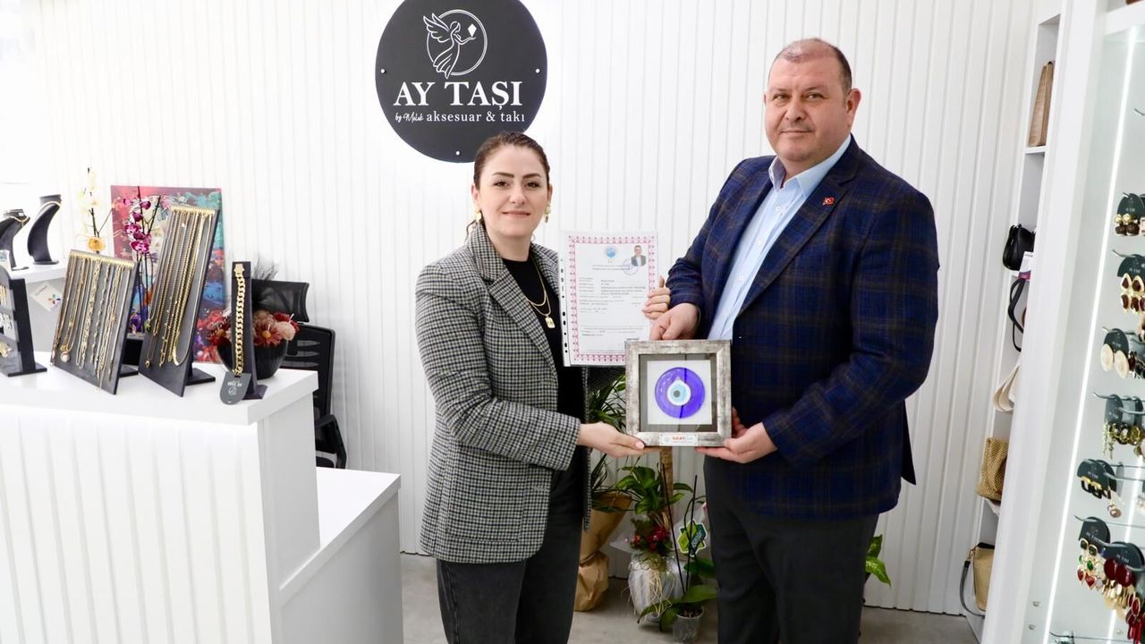 Menderes Belediye Başkanı İlkay Çiçek, eşi Melek Çiçek’in ilçeye kazandırdığı Ay Taşı Aksesuar ve Takı işletmesinin ruhsatını sürpriz bir şekilde kendisi takdim etti. Yapılan ziyaret sırasında Melek Çiçek, eşinin bu jestini mutlulukla karşıladı. Başkan Çiçek, ruhsatı teslim ederken eşine iş dünyasında başarılar diledi.