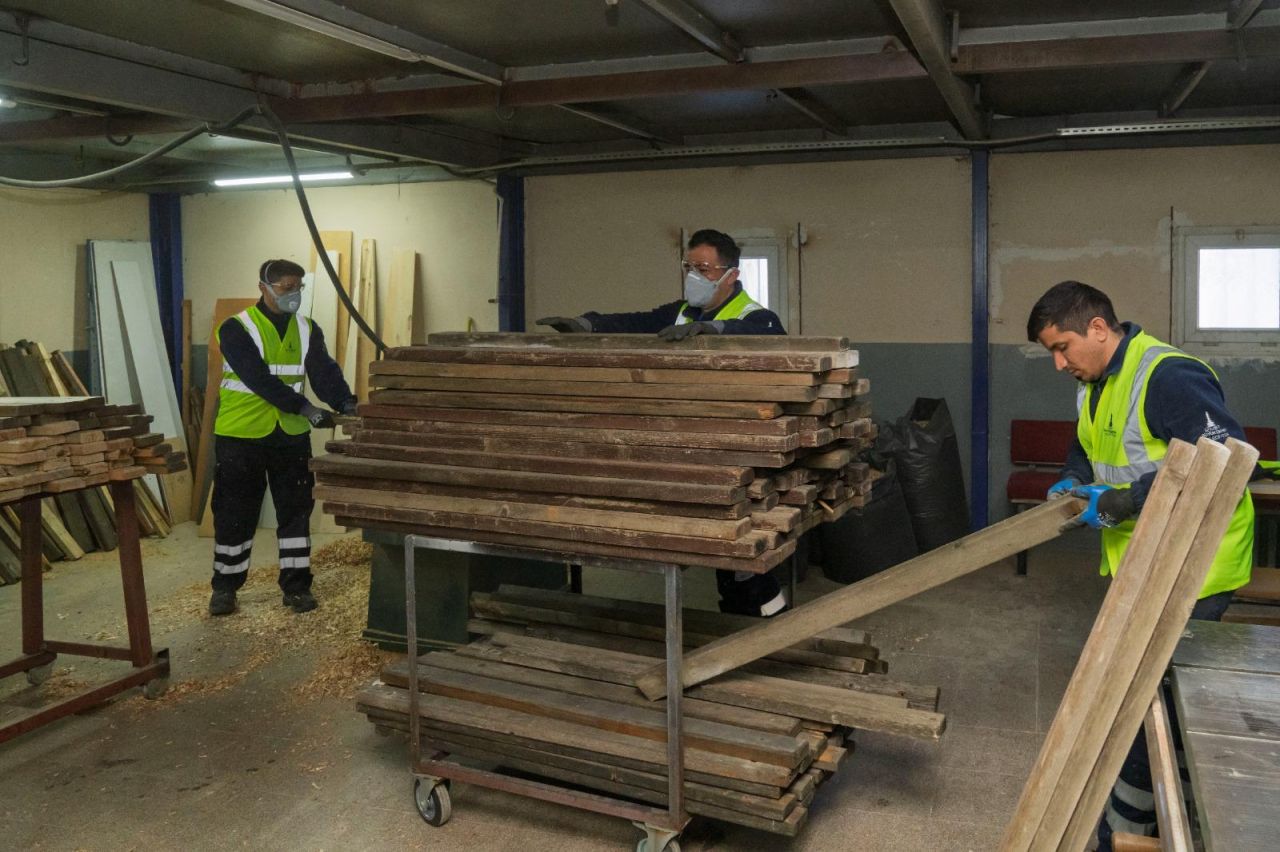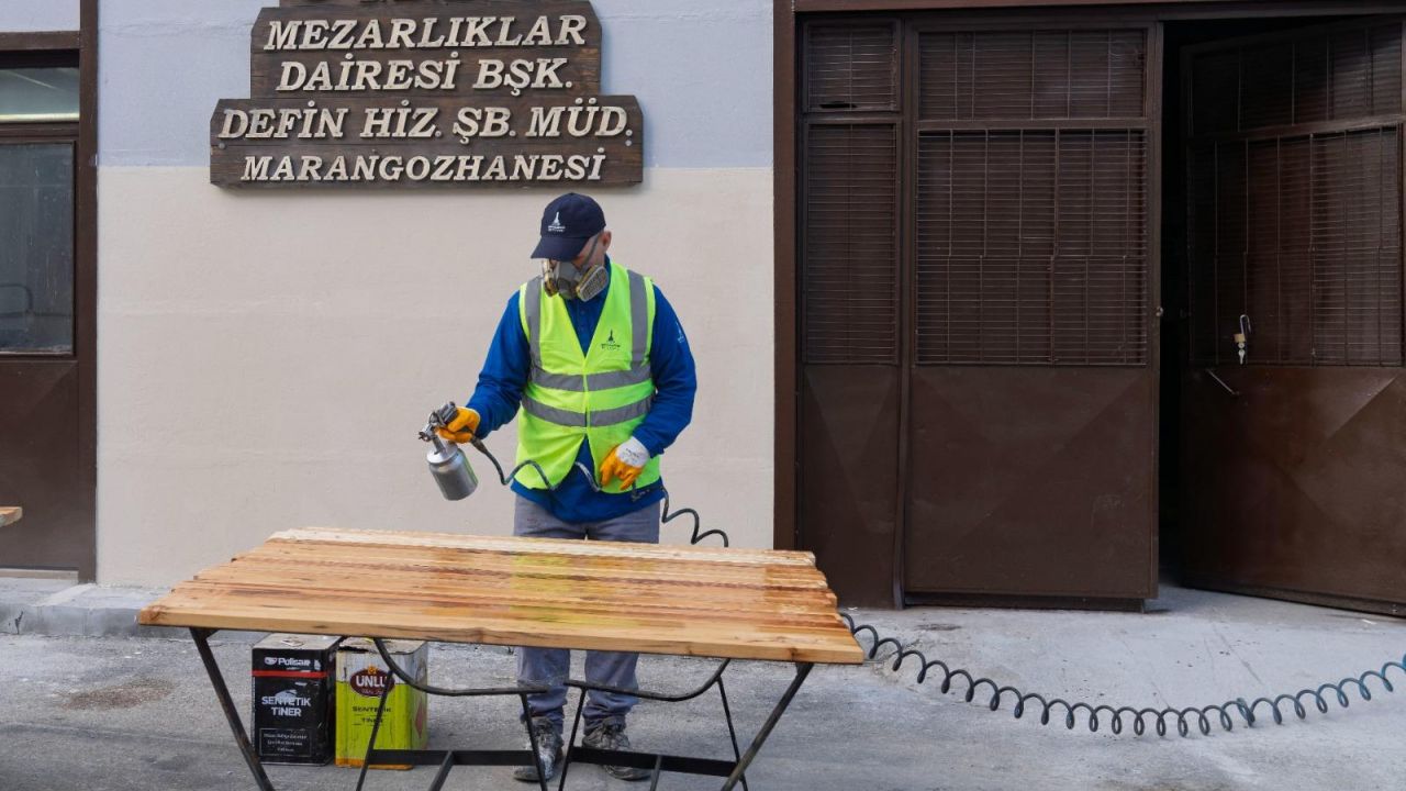 Mezarlıklar Dairesi Başkanlığı bünyesindeki marangoz atölyesinde titizlikle yürütülen çalışmalar kapsamında, kent genelindeki yaklaşık 2 bin mezarlık alanında budanan ağaçlar kullanıma kazandırılıyor. Testere makinelerinden geçirilen keresteler mezar tahtası ve çit yapımında kullanılırken, eskimiş oturma bankları ve masalar da atölyede yenileniyor.