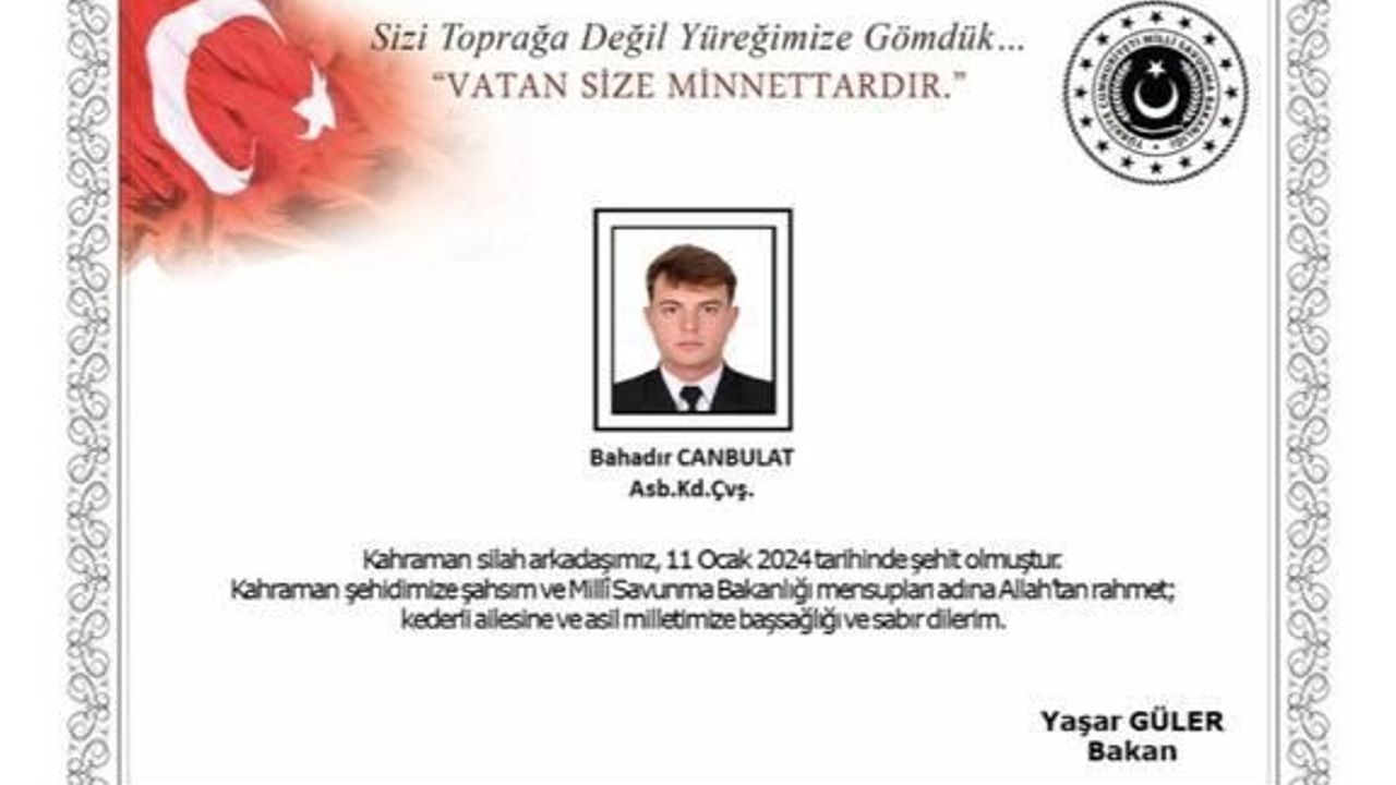 MSB’den yapılan yazılı açıklamada, “Denizkurdu Tatbikatı kapsamında 11 Ocak 2024 tarihinde mayın temizleme eğitimi icra eden TCG Edremit’te görevli Mayın Harbi Dalgıcı Astsubay Kıdemli Çavuş Bahadır Canbulat dalış eğitimi esnasında rahatsızlanmış, dalış doktoru tarafından ilk müdahalesi gemide yapılmıştır. Müteakiben personel ivedilikle hastaneye kaldırılmıştır. Ancak, hastanede yapılan tüm müdahalelere rağmen kurtarılamayarak şehit olmuştur. Bizleri derin bir acı ve üzüntüye boğan bu olayda, hayatını kaybeden aziz şehidimize Allah’tan rahmet, kederli ailesine, Türk Silahlı Kuvvetleri ile asil milletimize başsağlığı ve sabır dileriz” denildi.